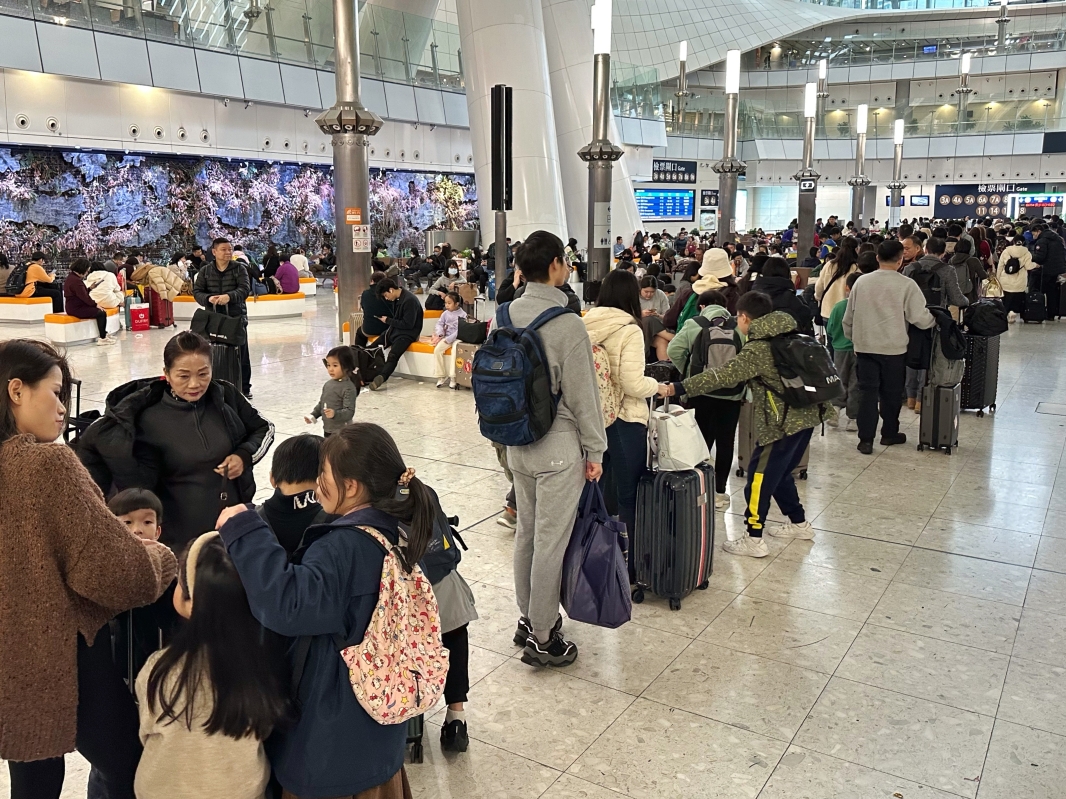 香港新聞網2月8日電(記者 謝光磊 ) 年關近,香港西九龍高鐵站迎返鄉潮年關將近,返鄉情切,嚴格意義上來說,今年是疫後完全恢復正常通關的第一個春節。2月8日,香港西九龍站人潮湧湧,一眼就能辨認出回家的人。拎著大包小包、塞得圓鼓鼓的行李,是他們積攢一年的思念和盼望,終於在春節踏上歸途。記者在香港西九龍站看到,大批旅客進出但繁忙有序。 香港特區政府入境處處長郭俊峯當天在記者會表示,預計今年農曆新年期間會有750萬人次進出香港,其中大約有600萬人次會經各陸路口岸進出,相信羅湖、落馬洲支線和港珠澳大橋的口岸最繁忙。