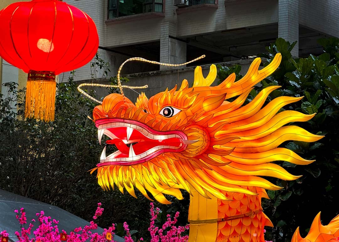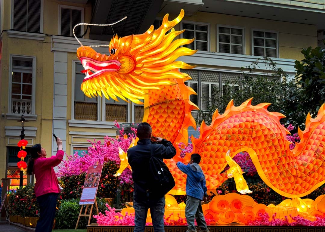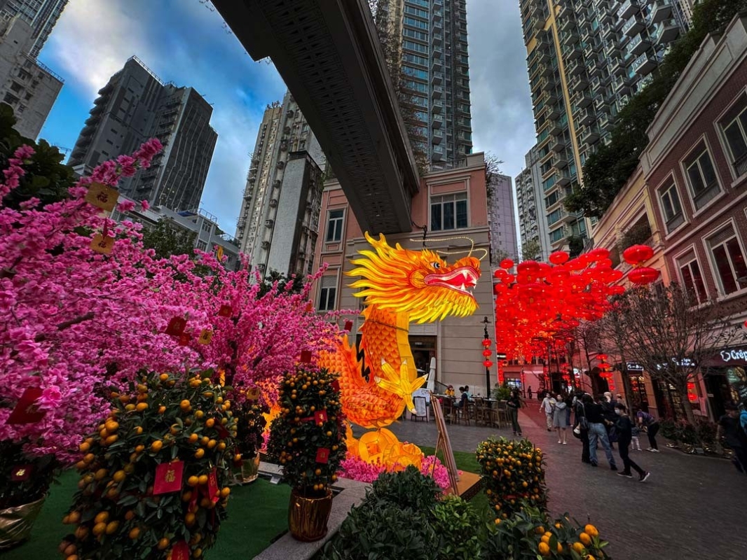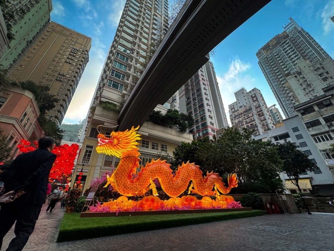 香港新聞網2月9日電 (記者 徐文峰)農曆新年將至,為迎接龍年,香港灣仔利東街洋溢著濃濃的年味,除了有傳統的大紅燈籠點綴200米長的林蔭大道,更於中庭打造一條金光閃耀、長達8米的巨龍,寓意將希望及福氣帶給社區,行運一條龍。市民徜徉在燈籠海下,滿臉紅光,喜氣洋洋。