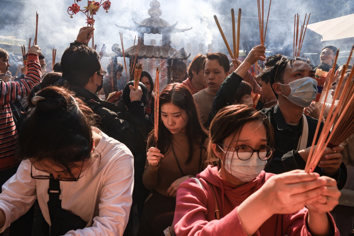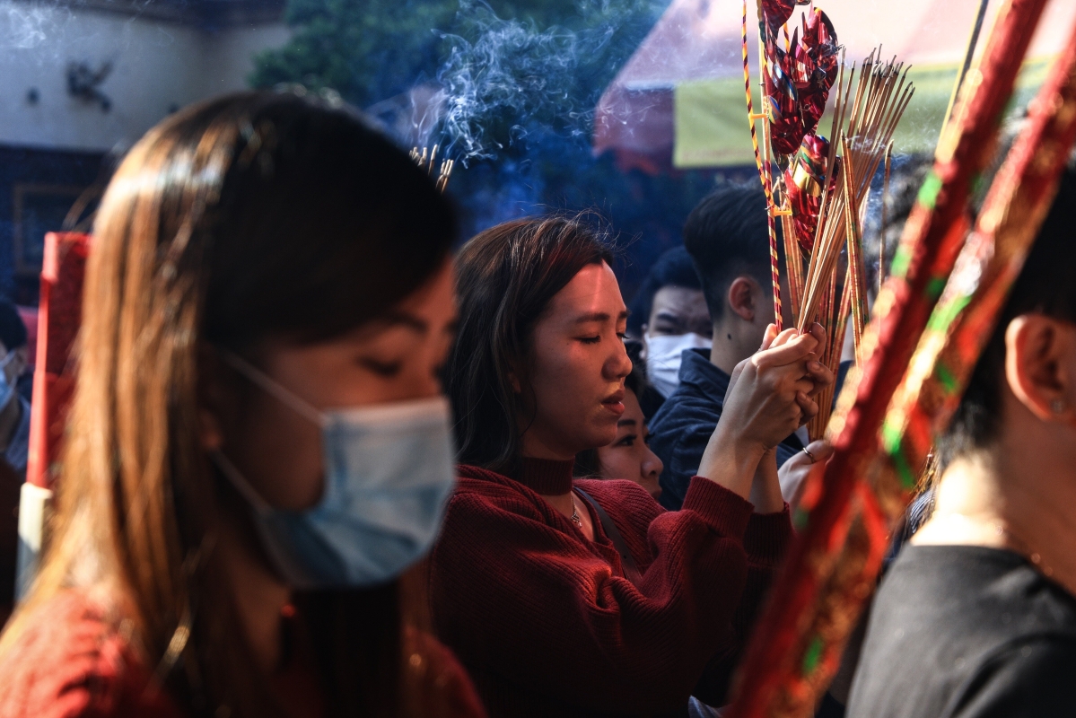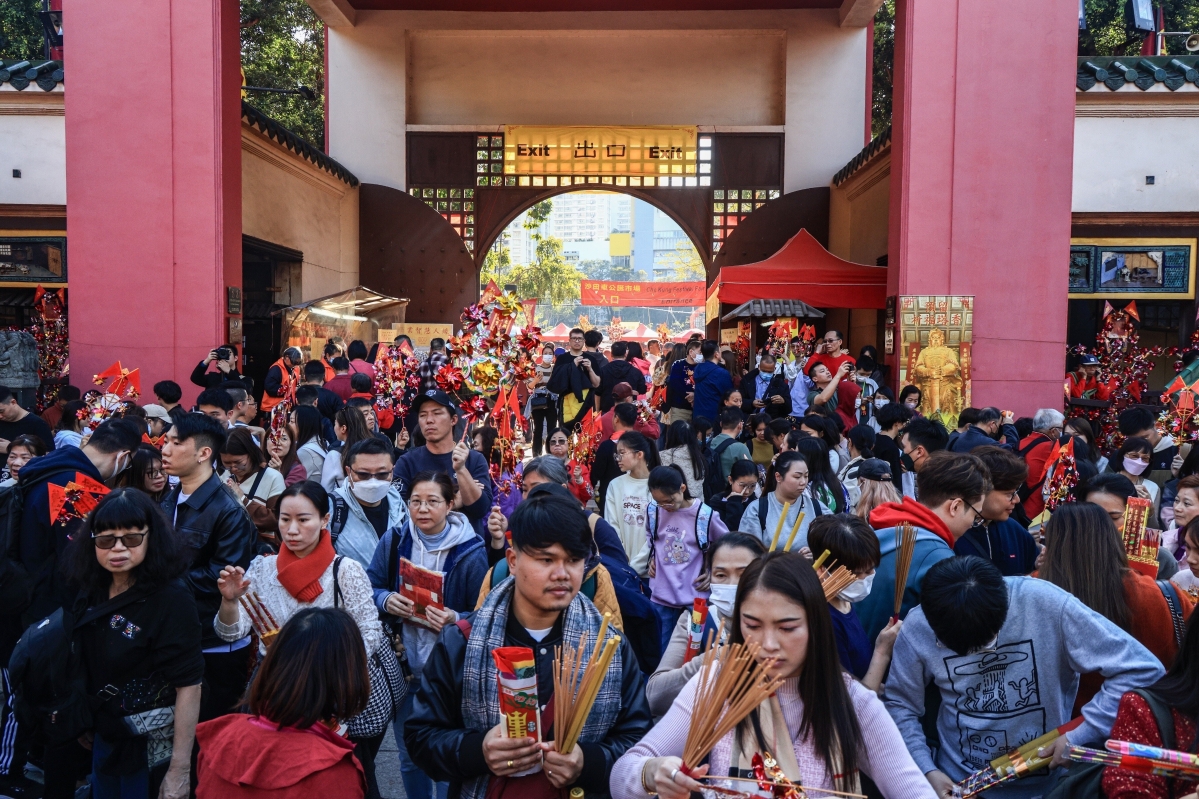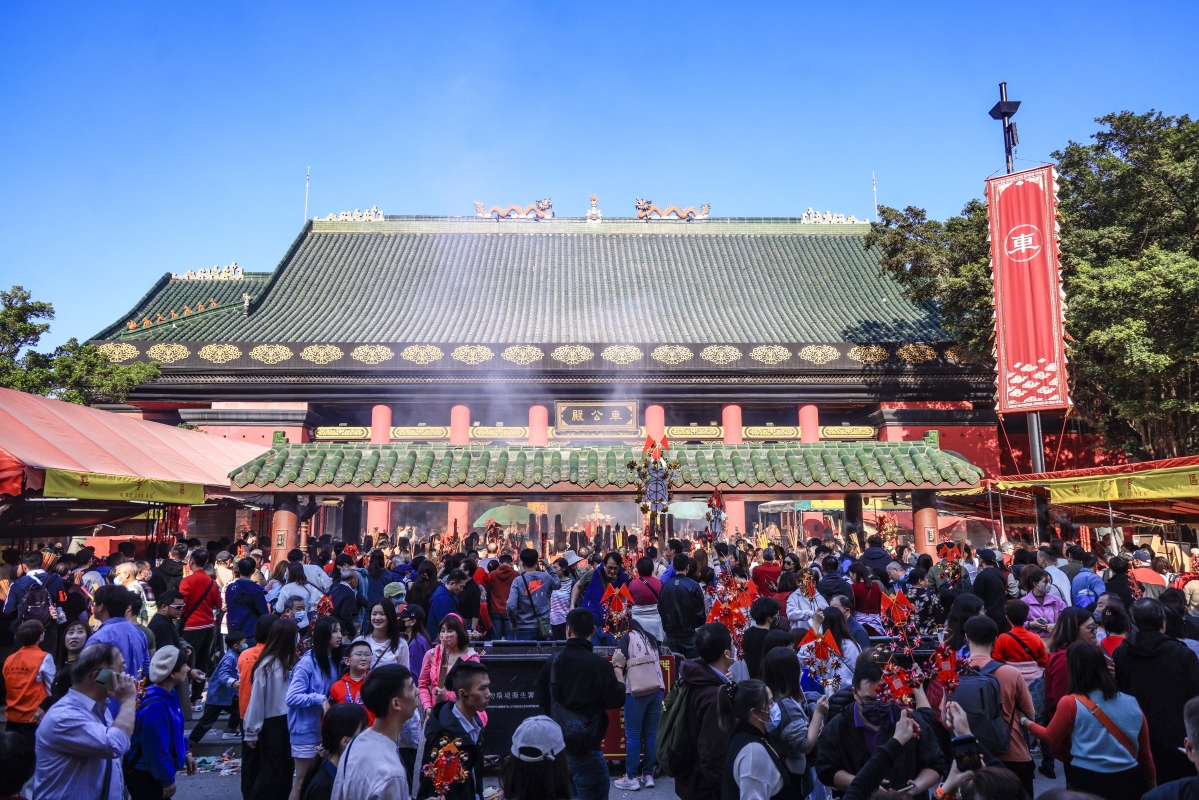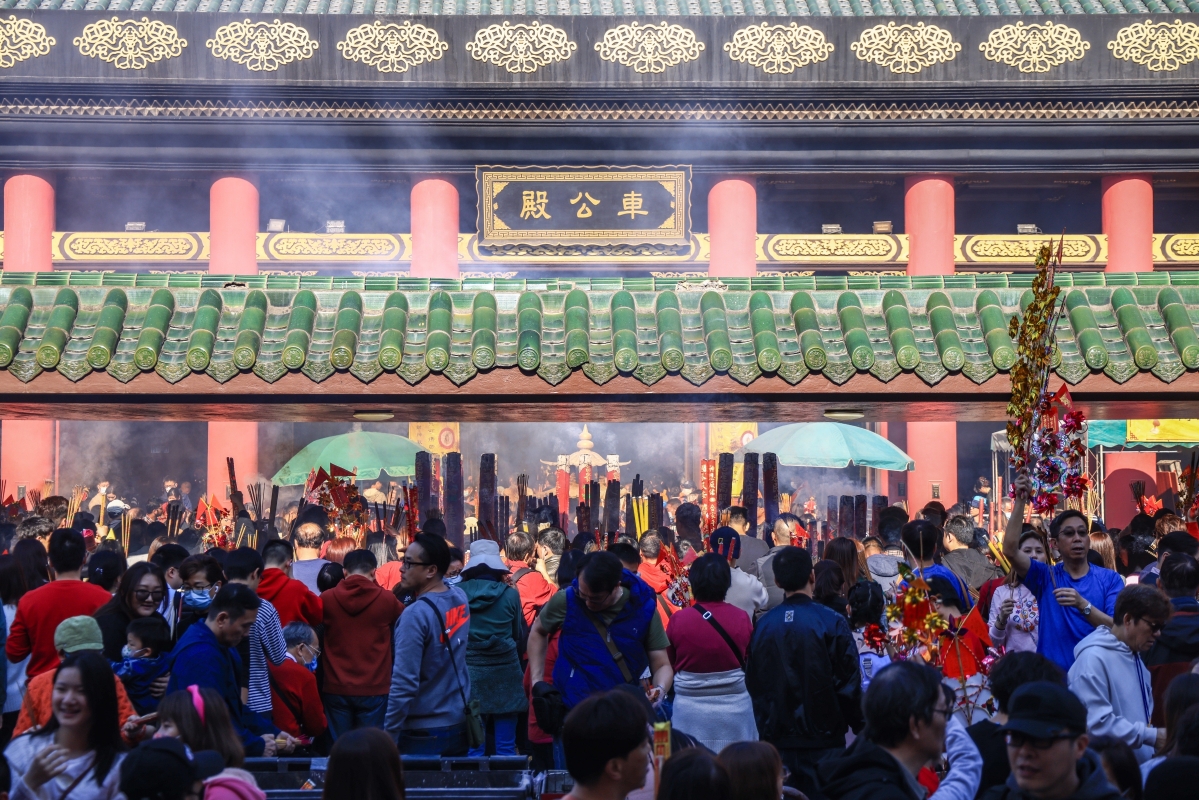 車公廟人頭湧湧、香火鼎盛,男女善信上香朝拜祈求新一年好運
