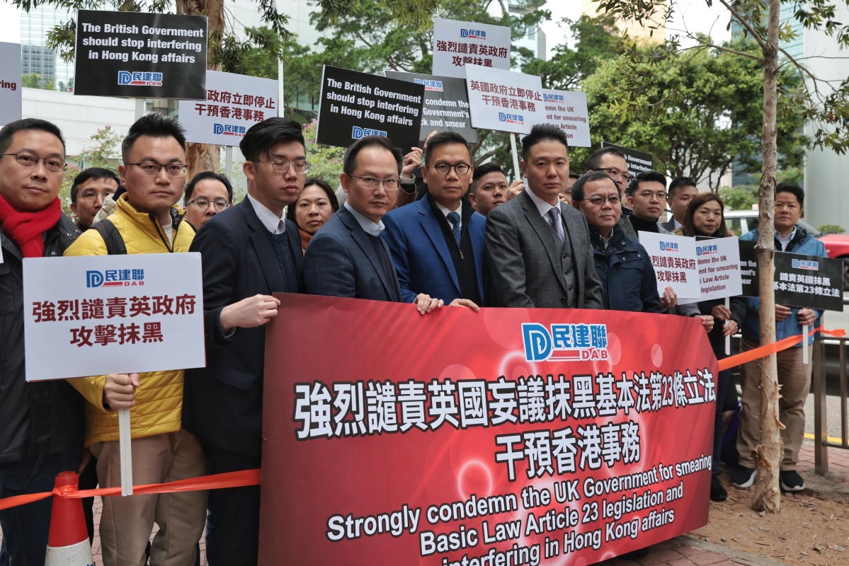 香港新聞網3月1日電(記者  謝光磊 )3月1日,香港民建聯在英國駐香港總領事館外抗議,強烈譴責英國妄議抹黑基本法第23條立法,敦促英方立即停止干預香港事務及任何無端攻擊抹黑。