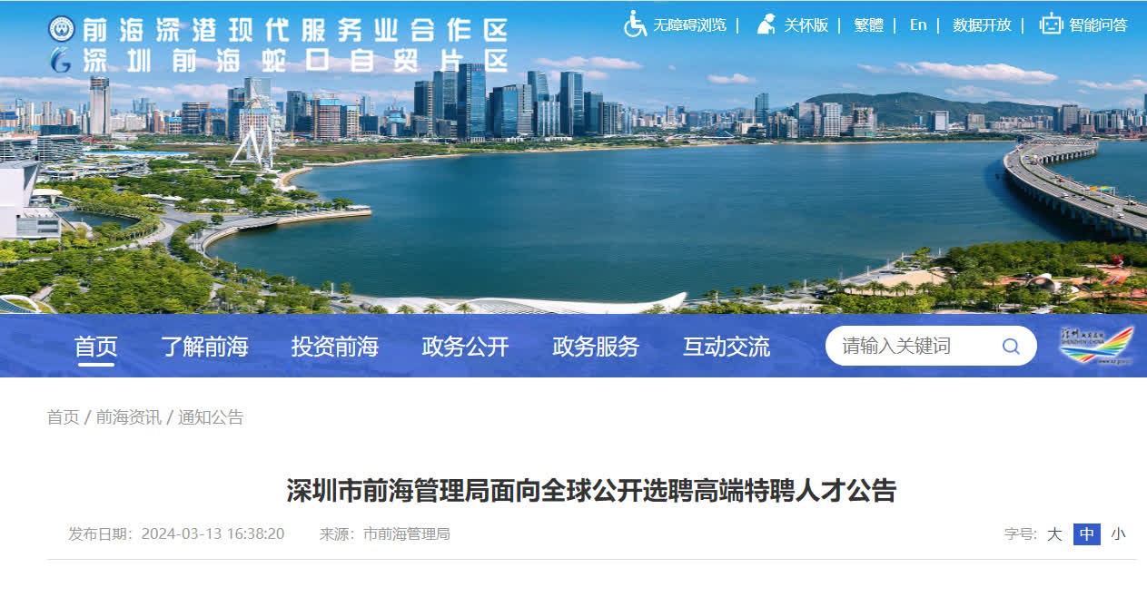 香港新聞網3月14日電 前海管理局首次面向全球選聘高端特聘人才,4個崗位港人可申請!為貫徹落實《全面深化前海深港現代服務業合作區改革開放方案》、《前海深港現代服務業合作區總體發展規劃》,拓寬港澳和外籍人士參與前海區域治理渠道,探索允許符合條件的港澳和外籍人士擔任前海合作區內法定機構職務,加大高層次專業化人才引進力度,助力打造全面深化改革創新試驗平台、高水平對外開放門戶樞紐、深港深度融合發展引領區、現代服務業高質量發展高地,前海管理局13日宣布,擬面向全球公開選聘4名高端特聘人才。