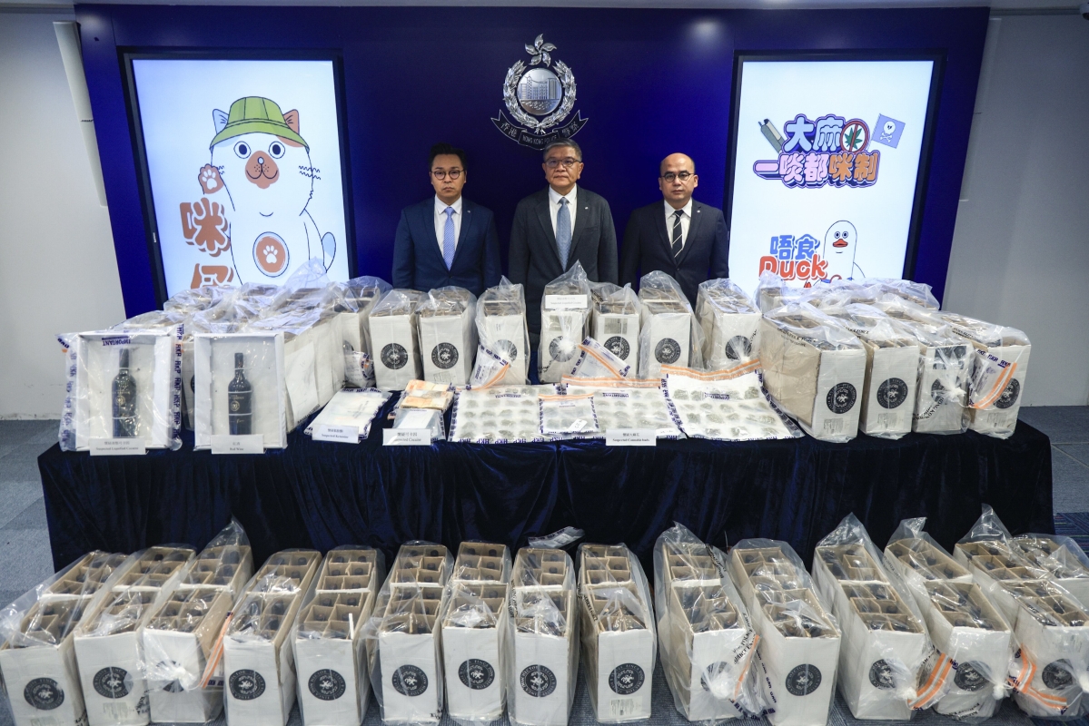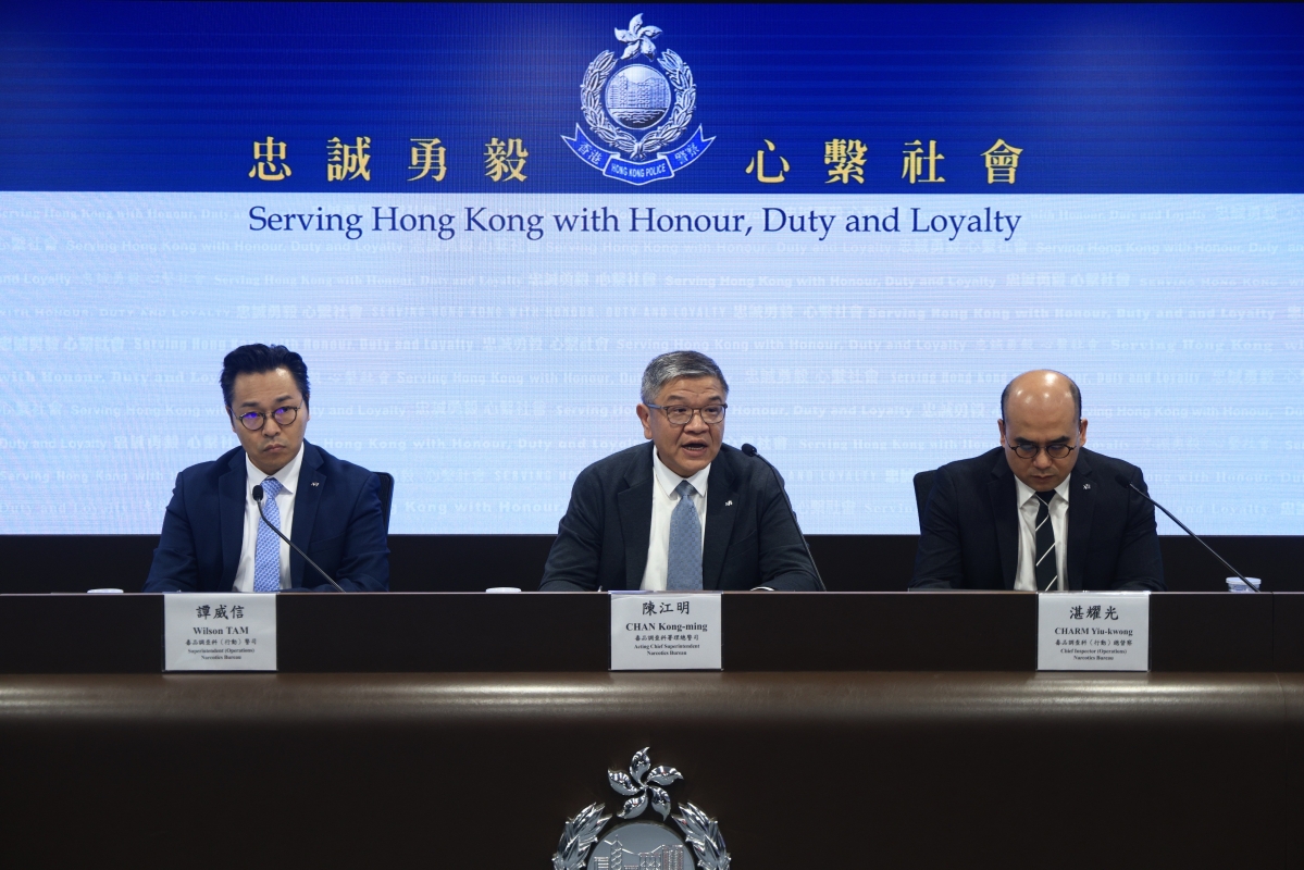 毒品調查科署理總警司陳江明(中)、警司譚威信(左)及總督察湛耀光(右)出席記者會
