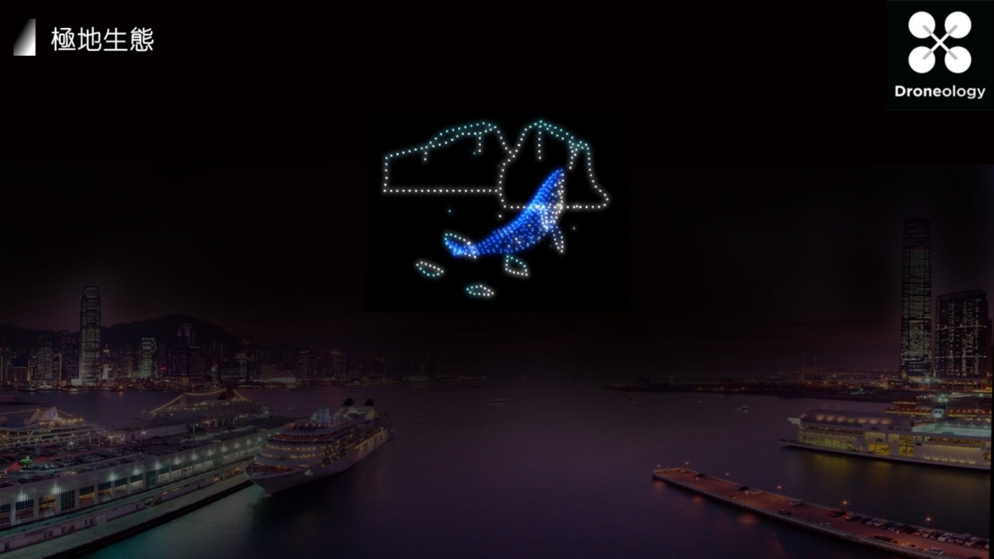 無人機模擬圖。 無人機表演將於尖沙咀海運碼頭“雪龍2”號上空進行,由晚上8時開始,時長約 15 分鐘。屆時,共500架無人機將翩翩起舞,組成“雪龍2”號3D 圖案 、極地生物如企鵝、鯨魚、海獅等圖案,讓維港夜空更加輝煌璀璨,和“雪龍 2”號身影形成絕妙配搭,巿民可捕捉獨一無二的歷史性照片。
