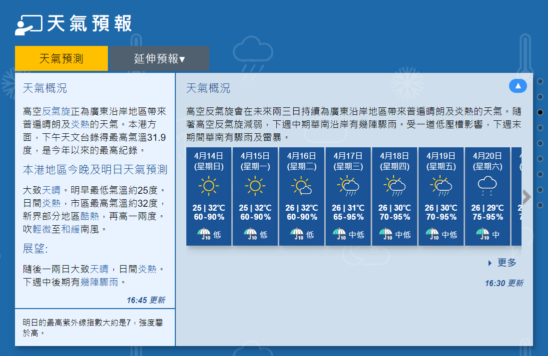 圖源:香港天文台。 天文台表示,高空反氣旋正為廣東沿岸地區帶來普遍晴朗及炎熱的天氣。預測香港14日最低氣溫約25度,日間炎熱,市區最高氣溫約32度;新界部分地區酷熱,再高一兩度。下週中後期有幾陣驟雨。 香港天文台曾於3月錄得31.5度高溫,是自1884年有紀錄、140年以來3月份最高溫度。至於有記錄以來4月份最高氣溫,則為1956年錄得的33.4度。(完) 【編輯:譚暢】