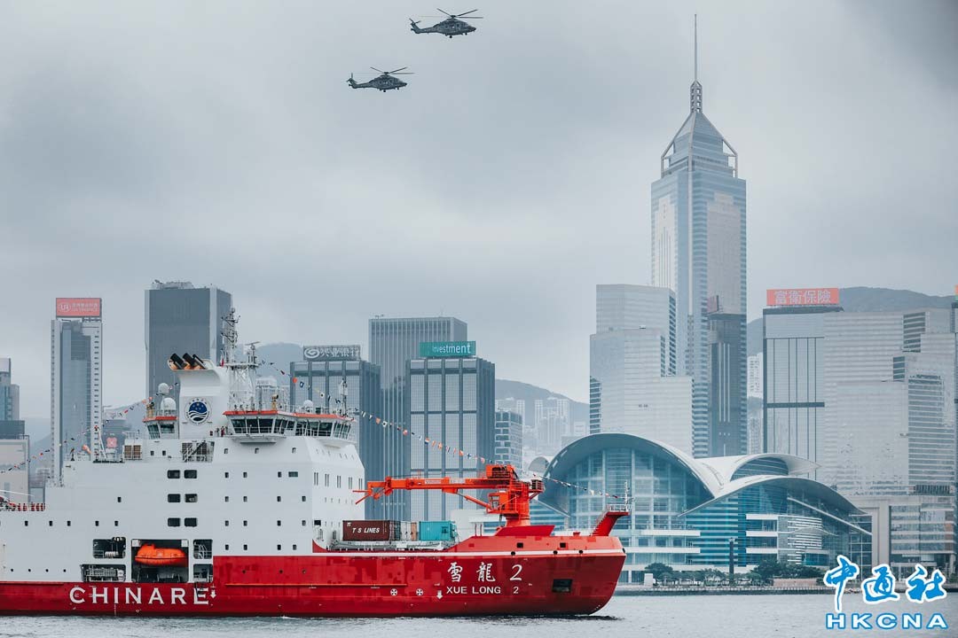 4月8日,中國第一艘自主建造的極地科考破冰船“雪龍2”號和中國第40次南極考察隊,抵達香港展開5天訪問。當日早上,“雪龍2”號於維多利亞港巡遊,“雪龍2”號訪港籌委會聯同多個政府部門舉行盛大的海陸空歡迎儀式,吸引了大批公眾前來打卡。(香港中通社記者 許其皓攝)