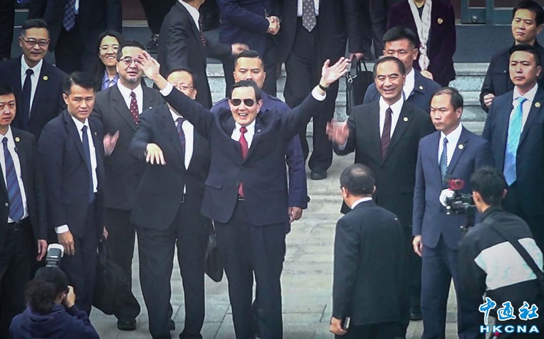 4月9日,台灣當局前領導人馬英九帶領大九學堂學子來北京大學交流結束後,離開北大英傑交流中心時向現場等待學生揮手問好。(香港中通社記者 孫晉欣攝)