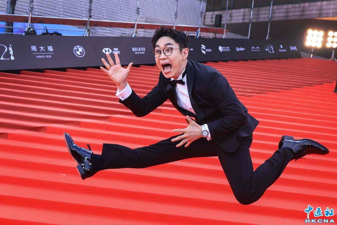 4月14日,第42屆香港電影金像獎頒獎典禮在香港文化中心舉行。圖為演員大鵬亮相紅地毯。(香港中通社記者 許其皓攝)