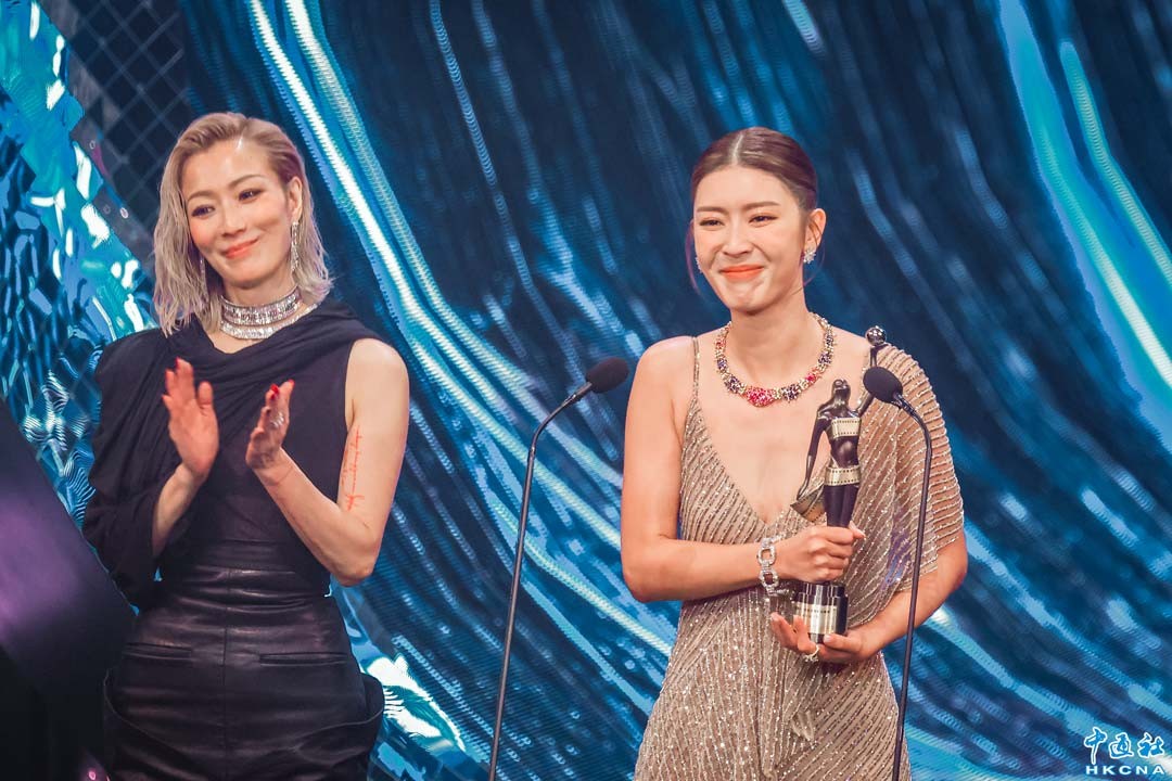 4月14日,第42屆香港電影金像獎頒獎典禮在香港文化中心舉行,余香凝(右)憑電影《白日之下》獲得最佳女主角。(香港中通社記者 許其皓攝)