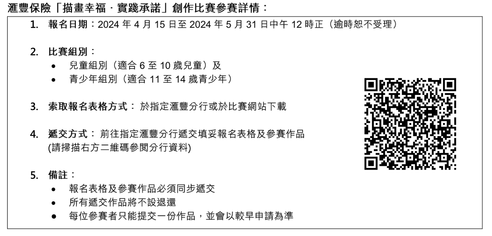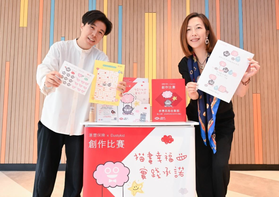 主辦方供圖 “描畫幸福,實踐承諾”創作比賽邀請到星級評判謝安琪及Dustykid“塵爸”,選出共100名優勝者,得獎作品將於滙豐總行地下大堂特別設計的畫廊展出。除此之外,每組首10名得獎者會獲得港幣2,000元書券,他們的作品更會被收錄於“描畫幸福.實踐承諾”故事書。歡迎滙豐銀行客戶提名有興趣的小朋友參加,比賽更透過滙豐遍佈全港的龐大分行網絡,方便客戶到指定分行索取報名表格及遞交作品。 滙豐保險邀請香港小童群益會成為是次比賽的支持機構,協助派發報名表格及收集參賽作品。機構擁有全港最大的兒童及青少年中心網路,機構網路覆蓋51,000名年齡介於6至14歲的兒童及青少年,其服務更遍及15間小學和38間中學。滙豐保險希望透過與香港小童群益會合作推廣比賽,令更多人關心兒童及青少年心理健康的重要性。