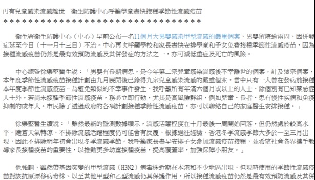 香港新聞網4月20日電 香港衞生署衞生防護中心20日正調查一宗兒童感染甲型流感死亡個案,並提醒社會各界提高警覺,預防流感。中心呼籲市民踴躍接種季節性流感疫苗,以應對流感季節。 個案涉及一名過往健康良好的八歲女童。她17日起發燒及咳嗽,18日出現抽搐。她同日被帶到廣華醫院急症室求醫,並入院接受治療。病人的呼吸道樣本經化驗後,證實對甲型流感(H1)病毒呈陽性反應。病人情況在入院後轉壞,並於18日不治。 衞生防護中心初步調查顯示,病人沒有接種今季季節性流感疫苗,潛伏期內沒有外遊。她的家居接觸者至今沒有出現病徵。中心正繼續調查。 衞生防護中心發言人說,對高危人士而言,流感可引致嚴重疾病,而健康人士亦會受影響。接種流感疫苗是其中一種最有效預防季節性流感及其併發症的方法,亦可減低因流感而入院留醫和死亡的個案。除個別有已知禁忌症人士外,所有年滿六個月或以上的人士都建議接種季節性流感疫苗。有較高風險患上流感及其併發症的人士,包括長者及兒童,應盡快接種流感疫苗。由於人體在接種疫苗後需約兩星期產生抗體,市民應及早接種,預防季節性流感。有關疫苗接種計劃的詳情可參閱衞生防護中心網站。 同時患上流感與2019冠狀病毒病的患者有較大可能出現嚴重併發症和死亡,接種流感疫苗與新冠疫苗同樣重要,尤以兒童、社區安老及居於院舍的長者更應盡快接種。市民亦應注意良好個人和環境衞生,以防感染流感及其他呼吸道疾病,(完) 【編輯:張明臻】