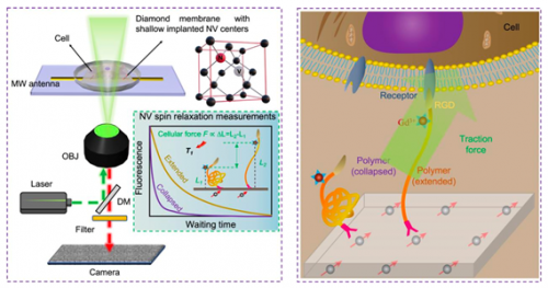 QDMTM從根本上改變了細胞間相互作用或細胞 - 材料相互作用等重要領域的研究方式,對生物物理學和生物醫學工程有重要意義。研究論文已經在學術期刊《科學進展》發表,題為“Quantum-Enhanced Diamond Molecular Tension Microscopy for Quantifying Cellular Forces”。 研究背景 持續與微環境相互作用和資訊交流,對於細胞的生存和執行生物功能至關重要,而透過精確量化細胞的黏附力,可理解當中細胞力調控的複雜性。過去幾十年,研究人員成功開發了各種方法來測量細胞黏附力,其中已被廣泛應用的有牽引力顯微鏡(TFM)、光鑷/磁鑷和基於分子張力的螢光顯微鏡(MTFM)等領先技術。然而,這些技術在靈敏度和資訊解析方面存在重大局限,螢光顯微鏡更有螢光染料光漂白的問題。於是,開發一種無需以螢光標記方式、能夠準確測量細胞黏附力的新技術,對於力學生物學的研究發展非常重要。 研究方法和發現 團隊利用可借細胞力拉伸的聚合物(作爲一種力感測器),結合金剛石中NV色心的縱向弛豫時間,實現“量子增強金剛石分子張力顯微鏡”(QDMTM)。NV色心電子自旋的量子特性,確保了 QDMTM 前所未有的靈敏度和精確性。 QDMTM創新技術的獨特之處,在於利用能夠將機械信號轉換為磁信號的力響應聚合物作爲“力感測器”。通過測量磁雜訊引起的NV自旋弛豫時間的變化,計算出細胞對“力感測器”施加的黏附力,從而有效地測量納米尺度下的隨機磁信號,這是現有的測量技術所無法實現的。 QDMTM新方法,為研究細胞黏附力提供了一種有效的途徑以分辨不同黏附狀態的細胞,團隊利用新技術量度不同細胞區域的力大小,結果與已知的研究結果一致,證明QDMTM方法能夠準確測量細胞黏附力。團隊下一階段的研究,目標是使用納米金剛石顆粒替換當前方案中的塊狀金剛石作為量子感測器,從而實現對細胞力在任意方向上的測量。(完) 【編輯:張明臻】