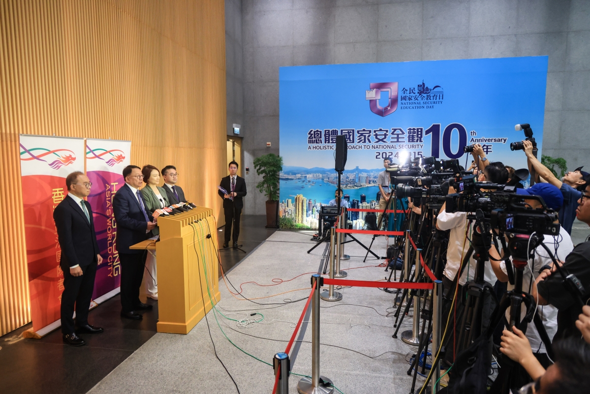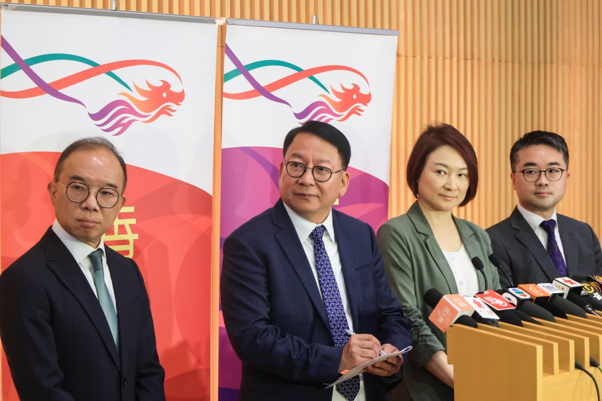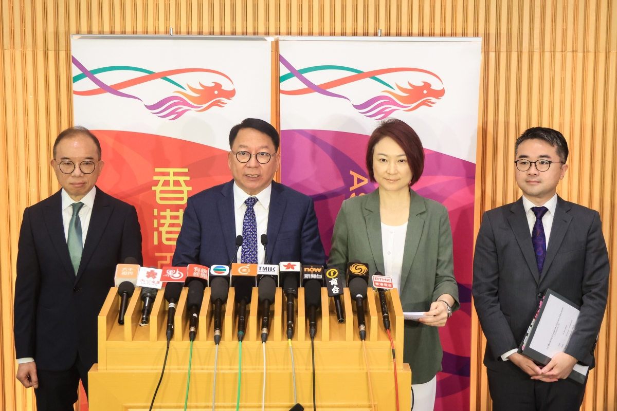 香港特區政府政務司司長陳國基(左二)聯同工作小組組長李慧琼(右二)和政制及內地事務局局長曾國衞(左一)會見傳媒
