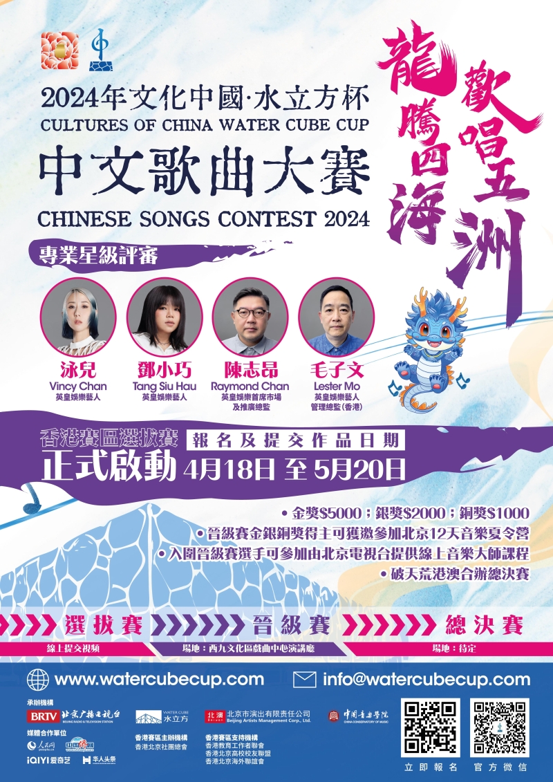香港新聞網4月30日電 一年一度全球華人盛事“2024文化中國‧水立方杯”中文歌曲大賽香港賽區現已啟動並開始接受報名,大賽自2011年已連續成功舉辦十三屆,吸引了超過4萬5千名選手參與,成為全球華人社區熱切期待的音樂文化盛會。 隨著上屆水立方杯賽事取得空前成功,香港賽區參加人數亦錄得新高。本屆大賽以“龍騰四海,歡唱五洲”為核心主題,秉持著對音樂文化傳承與創新的承諾,將全球華人的歌聲匯聚,宣揚中華文化之精髓。而香港賽區繼續面向12至17歲持有香港居民身份的青少年參加者,除為有志於歌手道路發展的青年人提供追夢的跳板及專業培訓外,更希望培養年輕新一代將中華文化帶向世界,展現香港作為中外文化藝術交流中心的獨特魅力。