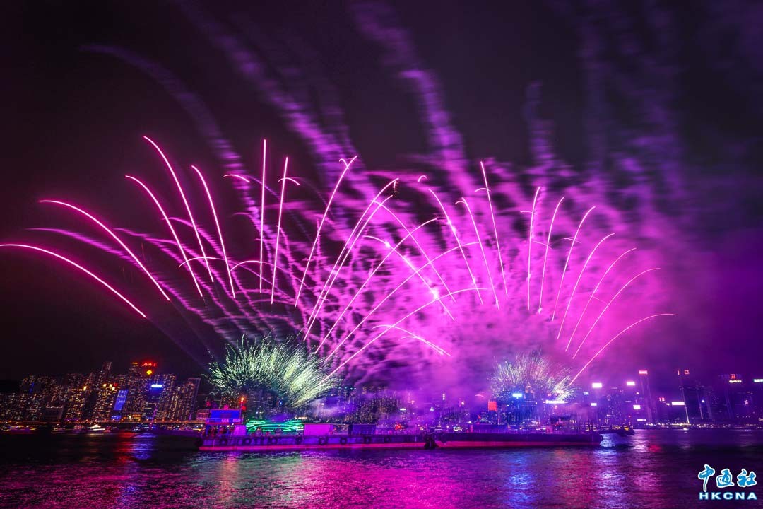 5月1日晚,香港維多利亞港上演五一海上煙火表演,表演以金色為主調,時長約10分鐘,由離岸130米的躉船發放,高低有序地發放至水面最高約100 米,交織成不同色彩斑爛的圖案。(香港中通社 許其皓攝)