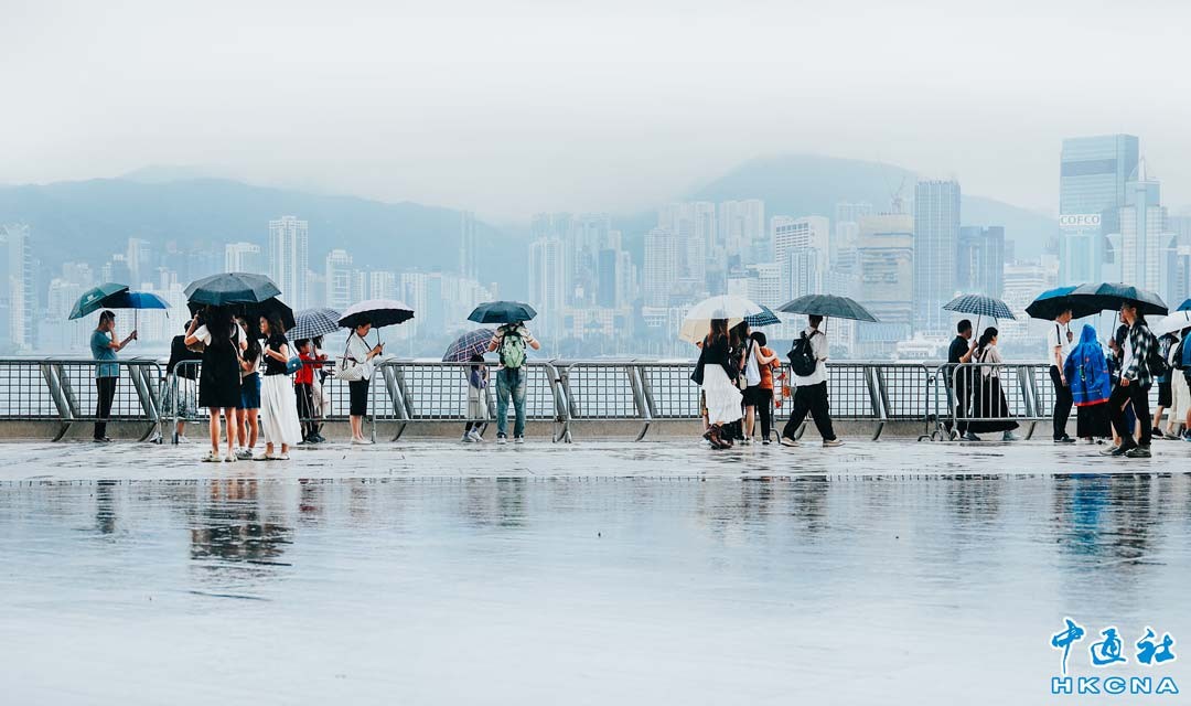 5月1日是中國內地五一黃金周首日,香港特區政府入境處處長郭俊峯表示,截至5月1日早上10時,有4.3萬名內地旅客入境,數字比平日多。圖為天雨依然無阻遊人熱情。(香港中通社記者 曹文毓攝)