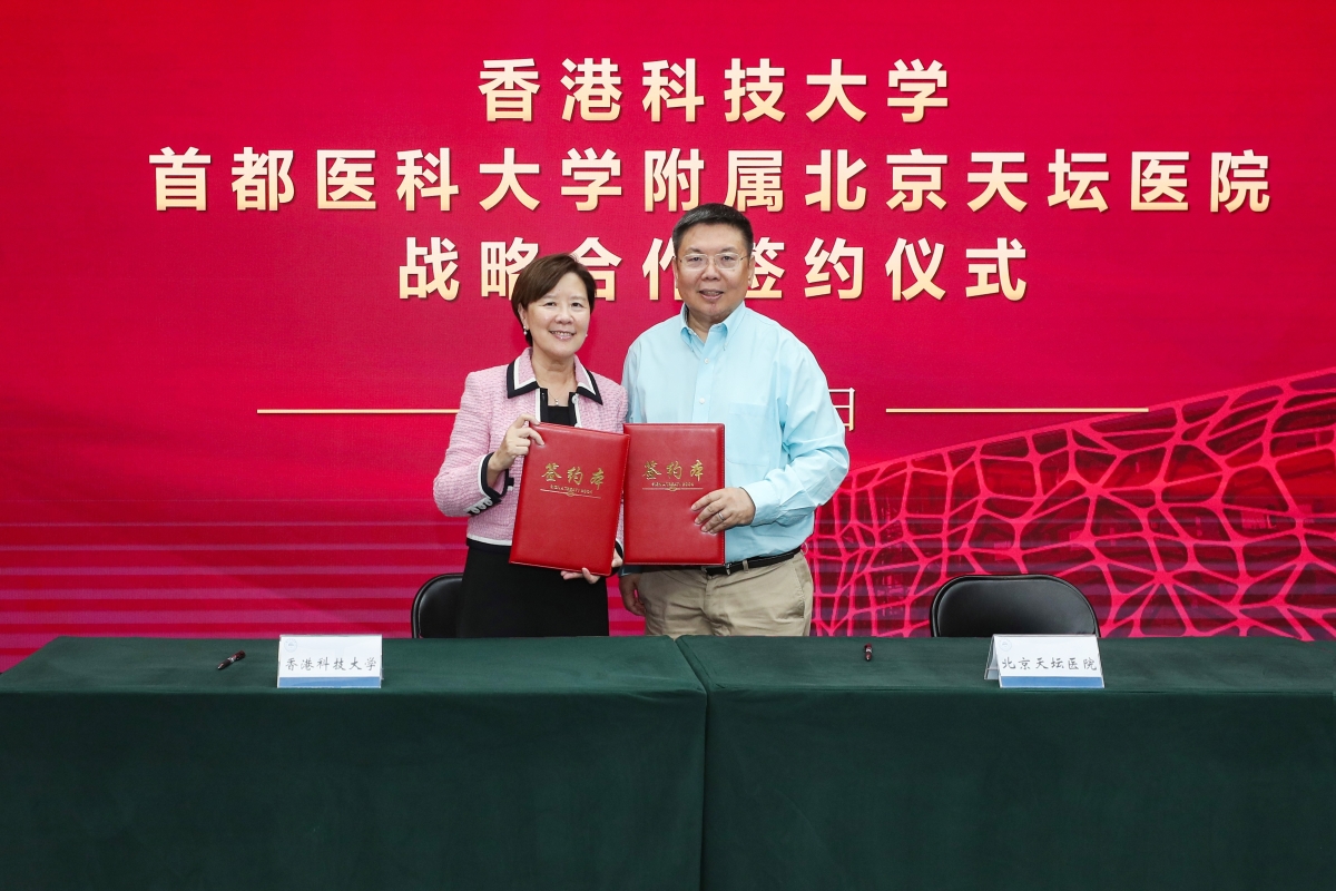 科大校長葉玉如教授(左一)、北京天壇醫院院長王擁軍教授(右一)。 科大校長葉玉如教授在簽約儀式上表示,此次簽約為科大與內地頂尖醫療機構合作的重要里程碑。我們希望透過此次合作,深化內地與香港在醫學研究及臨床領域的交流合作,以及培育新一代的臨床醫學人才,推動前沿科研成果更快地轉化為臨床應用,為兩地的生物醫學和衛生健康事業發展作出貢獻。 北京天壇醫院院長王擁軍教授亦表示:“北京天壇醫院始終致力於培養能夠從臨床發現問題、用科技創新的途徑來解决臨床問題的臨床醫學科學家,這與科大對新一代醫學人才的培育理念不謀而合。只有科研與臨床之間相互促進,提升研究成果的臨床轉化應用,才能切實讓更多患者看到希望。我們希望與科大的合作,能夠培養出既懂科研又具備臨床實踐經驗的臨床科學家,助力醫學發展。” 作為香港首家研究型大學,科大不僅具備深厚的研究基礎,亦聚集了一批國際領先的學者和專家,尤其在神經科學、遺傳學、生物工程、數據科學、人工智能、機械人,多組學和精準藥物發現等領域均處於國際先進水平。此外,科大亦積極推進內地與香港在科研和教育領域的合作,包括籌劃建立一所國際領先、面向未來的新型研究型醫學院,旨在培養具有研究能力的臨床醫生和轉化醫學人才, 推動前沿技術和醫療領域的融合發展。 北京天壇醫院是一所專注於臨床神經科學,集醫療、教學及科研為一體的三級甲等綜合醫院,是國家神經系統疾病的診療和科研中心之一,目前承擔著國家和北京市高質量發展、醫學科技創新與成果轉化等試點任務。北京天壇醫院在腦血管病、腦膠質瘤等神經系統疾病研究領域處於國際領先水平,近年來更是發力腦機接口、人工智能、機械人、大數據等尖端領域,並取得一定成就。未來,醫院將著力向著打造一流研究型、創新型醫院目標不斷努力。 多年來,科大和天壇醫院有緊密的科研合作關係,雙方去年曾共同開發一套機器學習模型,能預測腦膠質瘤患者接受治療後的康復進程和結果,為改善病人管理策略及實施精準腫瘤治療提供新方向。 (完) 【編輯:譚暢】