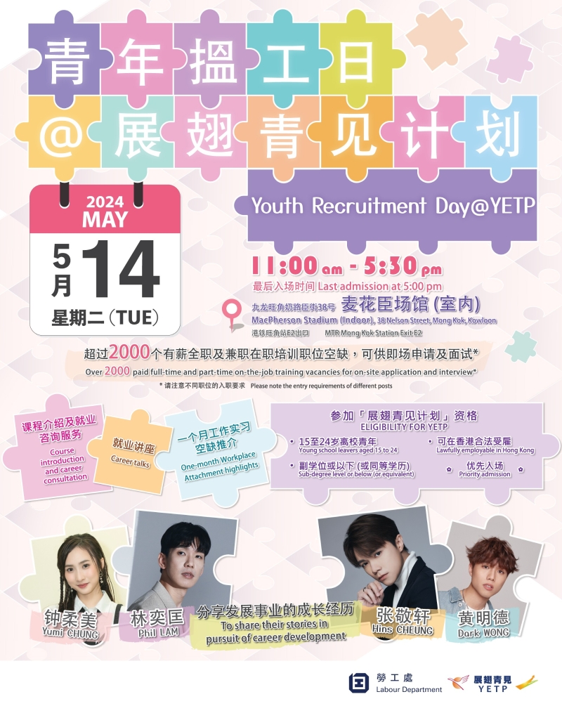 香港新聞網5月10日電 香港特區政府勞工處將於5月14日為15至24歲副學位或以下的青年舉辦“青年搵工日@展翅青見計劃”,提供超過2000個適合青年求職者的全職及兼職在職培訓職位空缺。 招聘會於旺角麥花臣場館舉行,共有33間機構參與,涵蓋運輸、航空服務、酒店、主題公園、公用事業、零售、飲食及物業管理等不同行業,提供超過2000個適合青年求職者的全職及兼職在職培訓職位空缺。