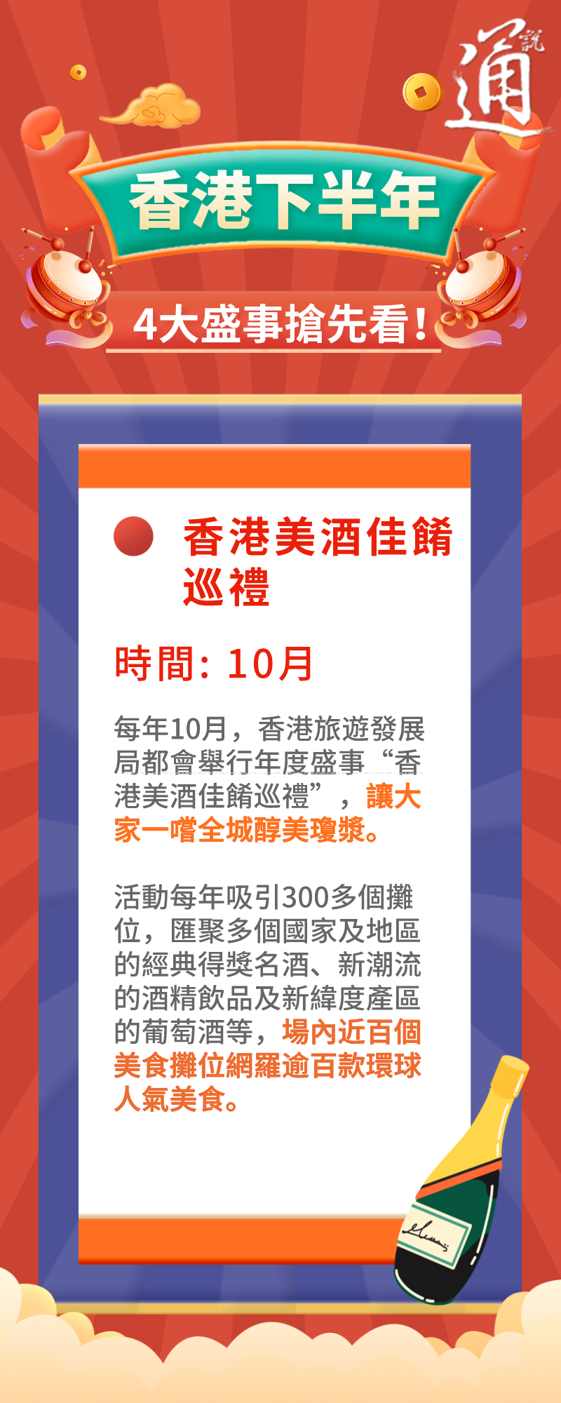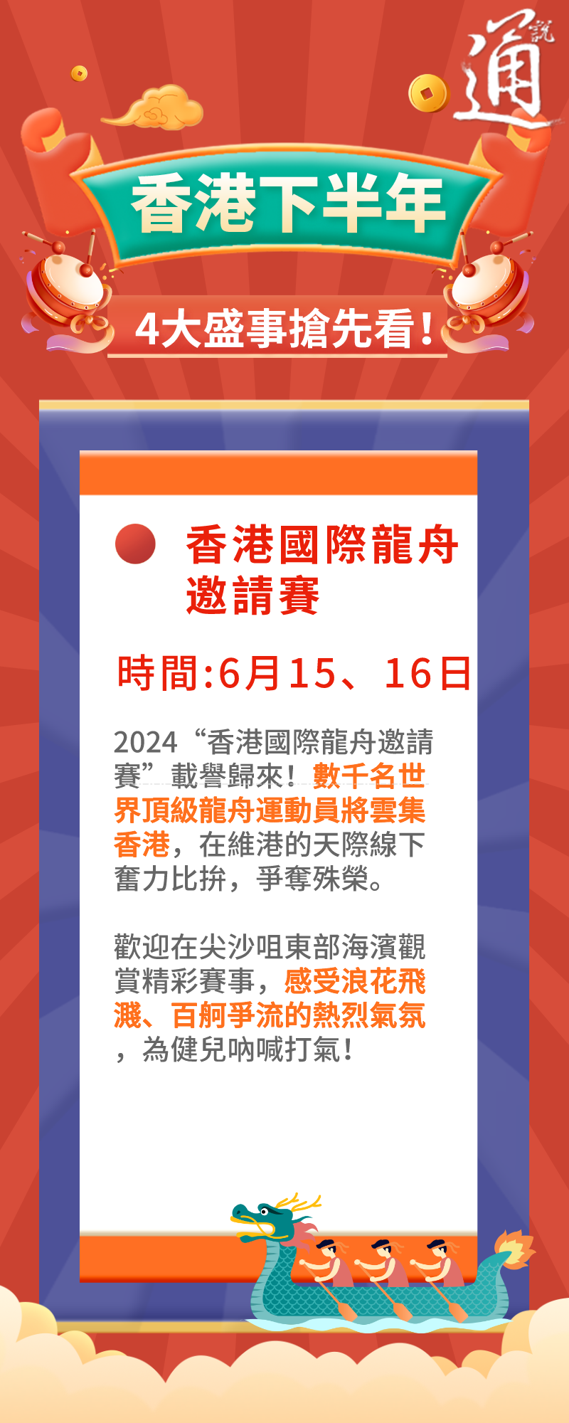 香港新聞網5月17日電 今年上半年香港已舉辦逾百項盛事,特區政府近日公布,未來數月還將舉辦不同盛事及精彩活動,包括中華文化節、2024年香港國際龍舟邀請賽、香港書展及香港美酒佳餚巡禮等,戳圖了解!