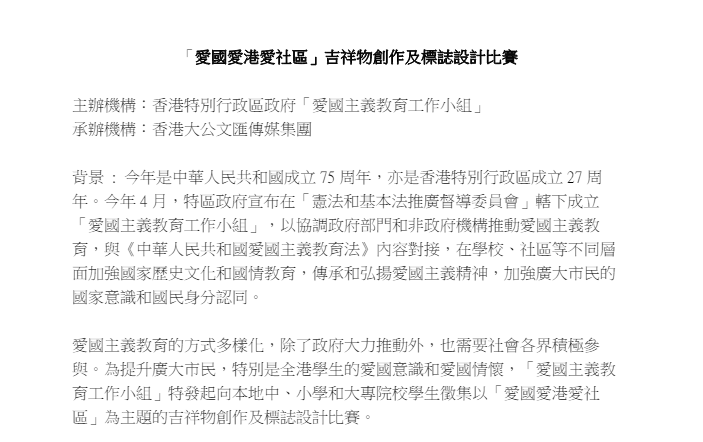 香港愛國主義教育工作小組舉辦“愛國愛港愛社區”吉祥物創作及標誌設計比賽分享到: