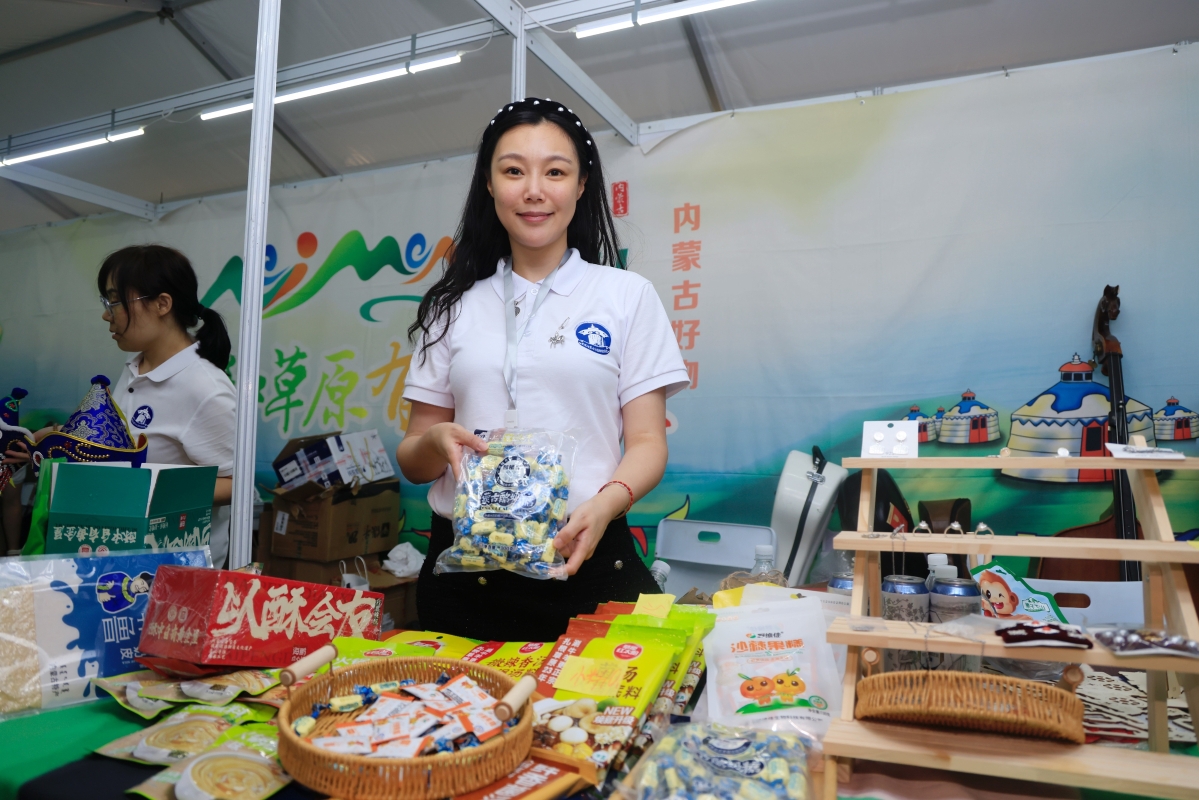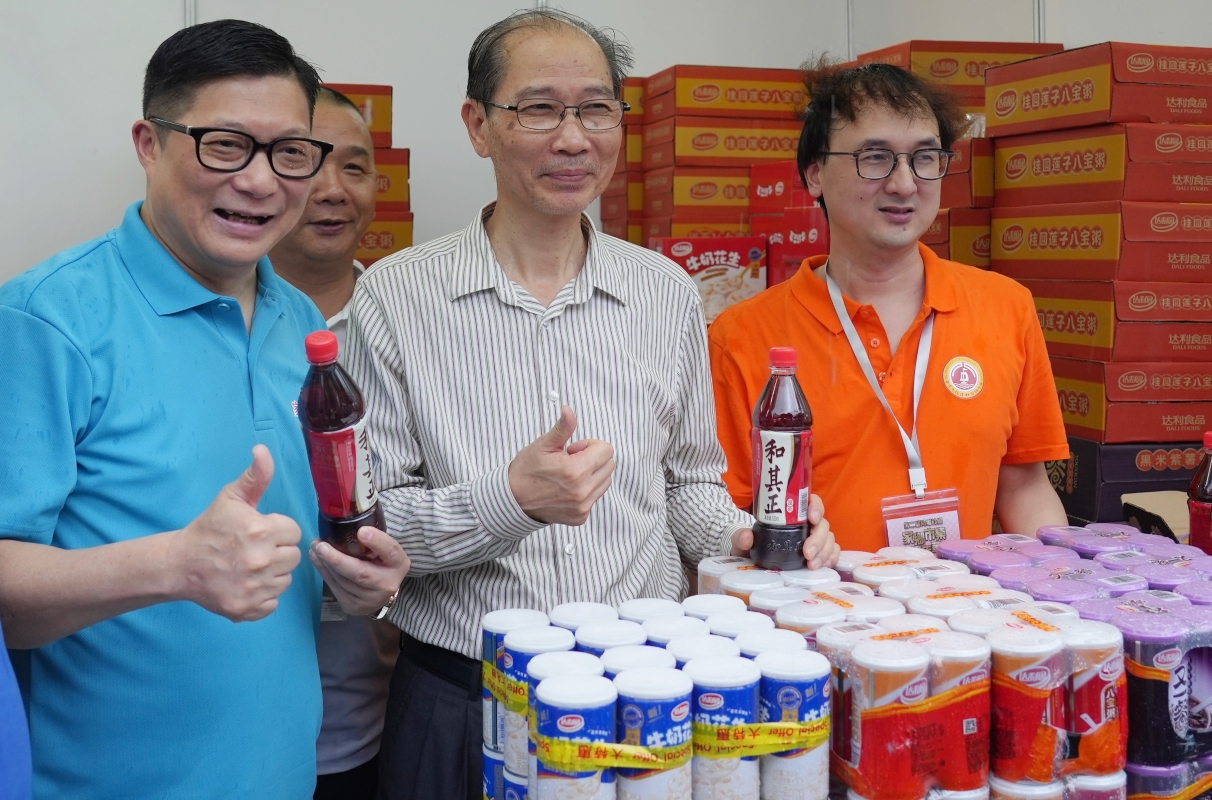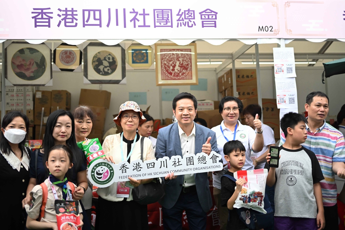 成都政協委員、區議員洪志傑在四川社團總會攤位推介家鄉特產