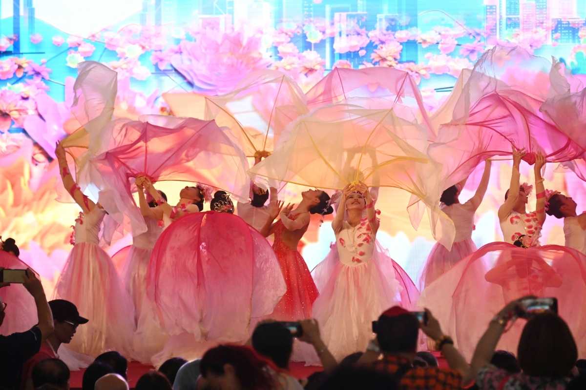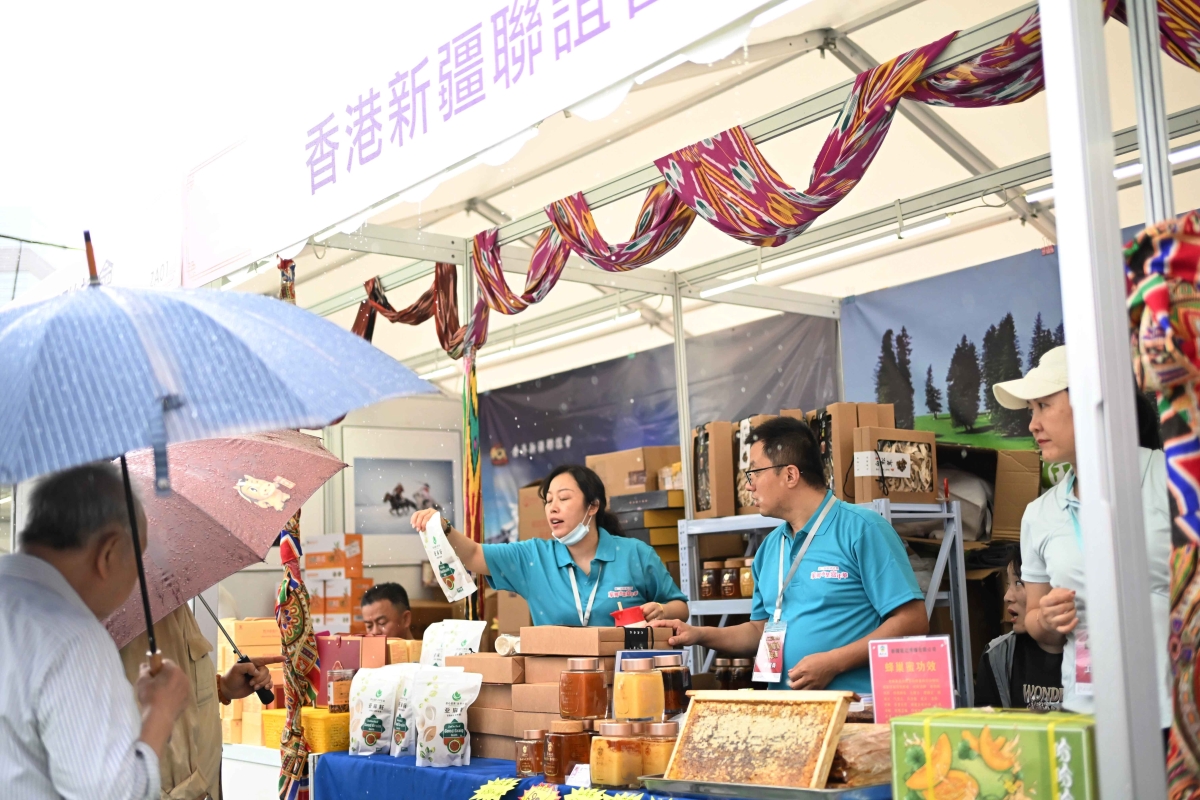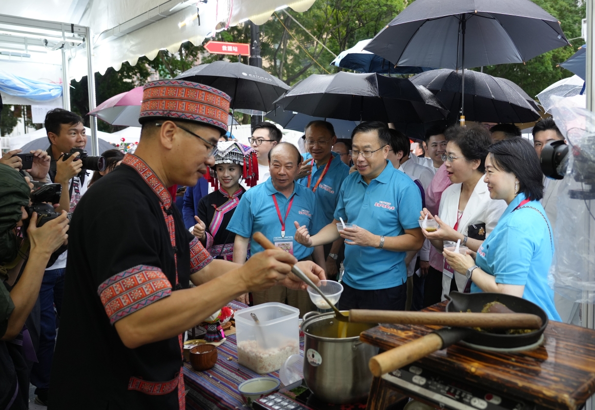 香港新聞網6月1日電(記者 洪少葵)6月1日,香港第二屆同鄉會家鄉市集嘉年華一連5天在維園盛大開幕。特區政府政務司司長陳國基、保安局長鄧炳強、中聯辦副主任何靖、外交部駐港特派員公署副特派員潘雲東、中央人民政府駐港維護國家安全公署聯絡局副局長謝志祥、香港廣東社團總會主席龔俊龍、香港福建社團聯會主席施清流等眾多社團代表出席啟動禮。 同鄉會家鄉市集嘉年華場內設置特產展銷、文藝表演、非遺展示、美食休閒四大版塊。繼去年成功舉辦首屆家鄉市集嘉年華,今年家鄉市集陣容更鼎盛、展品更豐富、內容更多樣。參與主辦的省級同鄉社團由去年的26個增加至28個,內蒙古及新疆兩個自治區同鄉社團加入。家鄉市集設置超過220個攤位,各省市特色產品琳瑯滿目、應有盡有。其中福建特產、各種名茶、潮州風味小吃等深受歡迎。不少市民和遊客在市集上購買到平、靚、正的心儀產品。除了展銷各地特產,市集還將帶來280多個特色文藝表演,新設的“中華美食一條街”,有超過20個熟食攤位,現場設有淄博燒烤、青島啤酒、天水麻辣燙、烤全羊等地方美食。同時,陳,如潮汕刺綉、東莞莞香、小欖菊綉、天南椰雕、德化瓷器等;市民可與非遺傳承人在現場互動,沉浸式體驗中華傳統文化的博大精深。