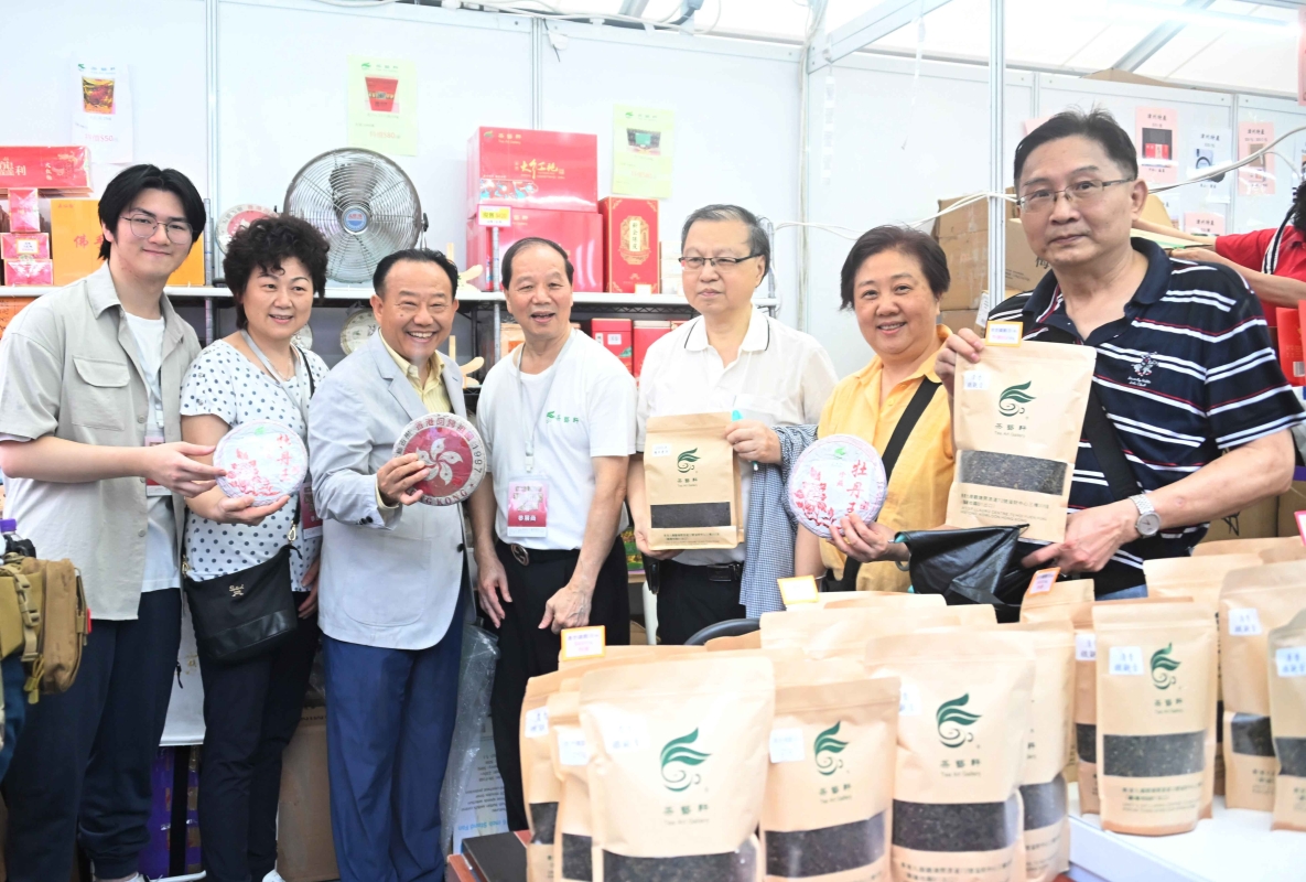 香港漳州市區同鄉會會長林紹奮(右三) 區議員、香港漳州市區同鄉會理事長余敏(左三)在香港“茶王”劉正慶(中)茶藝軒攤位推介茗茶