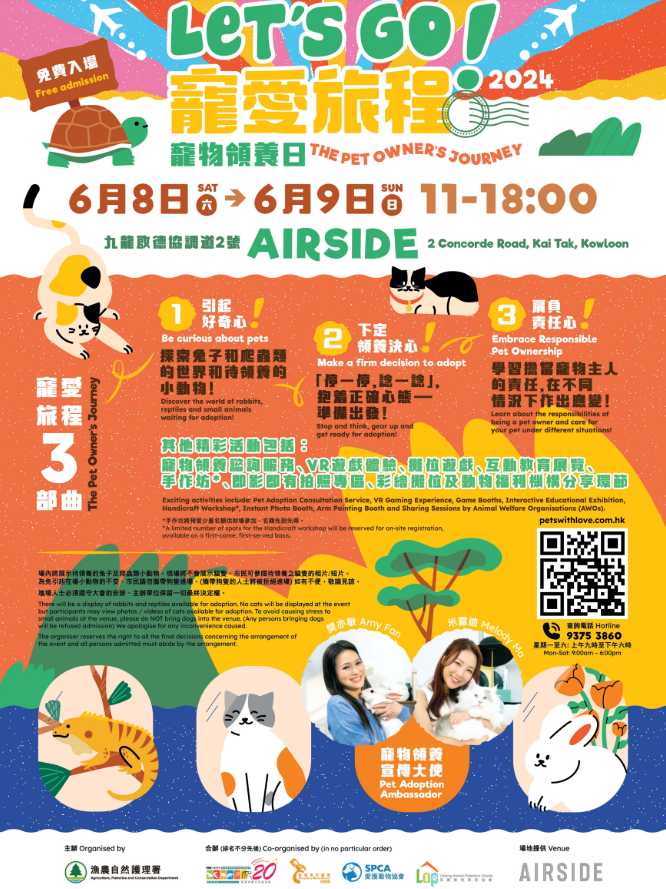 活動期間,參加者可親身接觸待領養的兔子和爬蟲類寵物,亦可參閱待領養貓隻的相片或影片。活動亦設有動物福利機構分享環節、VR遊戲體驗、攤位遊戲、互動教育展覽、手作坊、即影即有拍照專區及彩繪攤位。為免影響場內動物,市民請勿攜帶狗隻進場。 漁護署發言人說:“本署一直鼓勵有意飼養寵物的市民透過動物福利機構領養動物。漁護署所接收由畜養人放棄飼養的寵物或無人認領的動物,若經獸醫評估為性情溫馴和健康狀況良好,將交由本署伙伴動物福利機構安排供市民領養。本署亦會為市民經伙伴動物福利機構領養的貓、狗或兔子提供免費絕育。” 寵物領養日上午11時至下午6時在啟德AIRSIDE商場舉行,詳情請瀏覽活動網頁,或致電9375 3860(星期一至六上午9時至下午6時)。(完) 【編輯:譚暢】