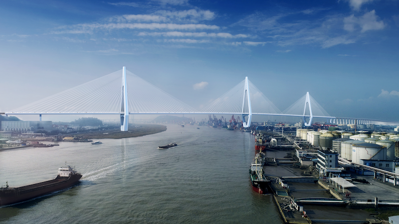 跨港區及甬江特大橋為三塔雙索面鋼混組合梁斜拉橋,主跨佈置為540+570米。P60主墩承台累計使用鋼筋400餘噸,澆築混凝土4500立方米。