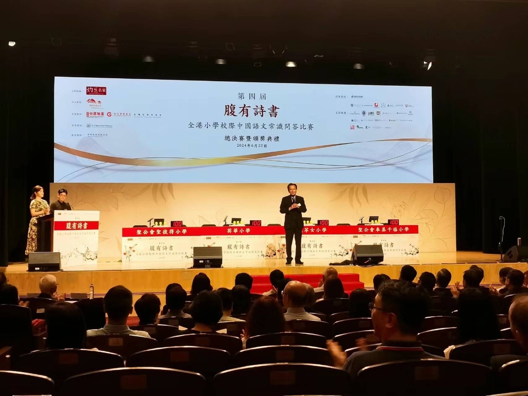 香港中通社圖片 灼見名家傳媒文灼非社長致歡迎辭,形容總決賽如科舉制度的最後一關──殿試,他稱讚到場的香港教育局副局長施俊輝作為會考十優狀元,投身教育界貢獻了許多心血,為師兄妹學好中文不遺餘力,感謝他今天出席為同學打氣。 文社長感謝來自14家大專院校的學者擔任顧問,為比賽提供許多寶貴的意見,以及一眾熱心的善長仁翁,連續幾年支持比賽。他表示,今年增加《論語》作為題目範圍,是希望同學飽讀詩書之外,也學會待人接物:孝敬父母、尊敬師長、與同學互相切磋砥礪,最終達至“氣自華”。 香港教育局副局長施俊輝致詞表示,中華文化源遠流長、博大精深,是我們學校教育、民族團結的重要一環。但豐富的文化內涵不僅是學校中的書本學習,還需要平時持之以恆的知識累積,這次比賽很好地用多元的方式激發了學生對中華文化的興趣,培養了學生的身份認同。 整個比賽分為必答環節、搶答環節與挑戰環節,由香港中文大學中國語言及文學系榮譽教授何文匯現場抽取題目,學生根據所學語文常識進行作答。出題內容多樣,涵蓋《論語》《詩經》及唐詩宋詞等諸多問題,充分考驗參賽者的理解與思辨力。 最後挑戰環節競爭激烈,前兩屆冠軍聖公會聖彼得小學與英華小學比分不相上下,故最後一題難度加大,請學生按照格律及意義,將五個漢字填入四句近體詩。英華小學學生憑藉精準的理解及對格律規則的掌握,完美補全整首詩詞,領先30分勝出。 “出題的重點在於詩律和論語,因為粵方言很適合保存和弘揚古典詩歌的格律,與古音差不多百分百對應,而普通話則沒有入聲聲調,既是我們的優勢也是責任。”何文匯說。他更在現場與同學們進行平仄對詩,進一步討論中國古詩詞中的韻律之美。(完) 【編輯:陈卓仪】