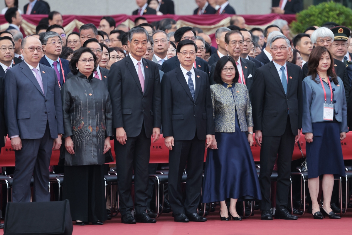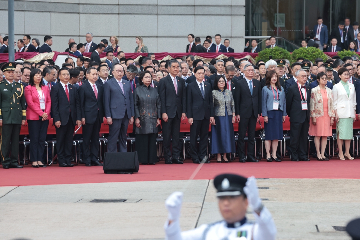 全國政協副主席梁振英、香港特區行政長官李家超、香港中聯辦主任鄭雁雄、前任行政長官曾蔭權、林鄭月娥等出席升旗儀式