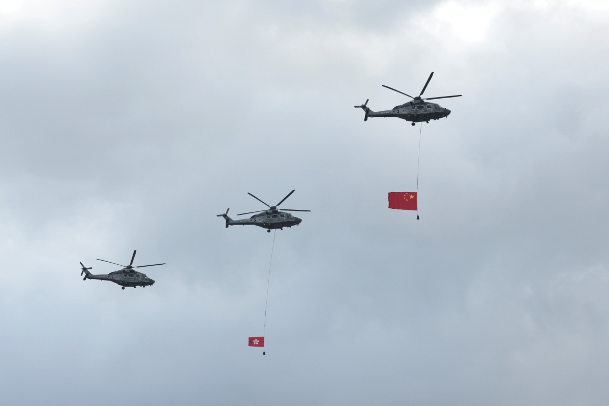 香港特區政府飛行服務隊直升機在維多利亞港上空飛過,展示大型的國旗和區旗 【編輯:洪少葵】