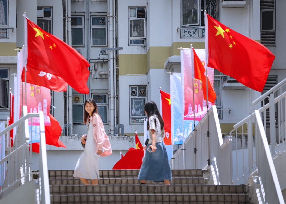香港深水埗大街上掛滿中華人民共和國國旗和香港特區區旗,一片喜氣洋洋