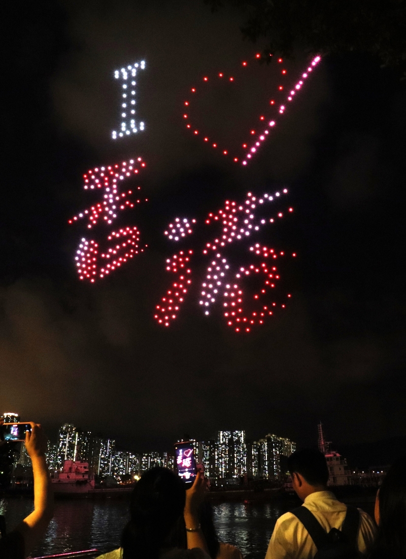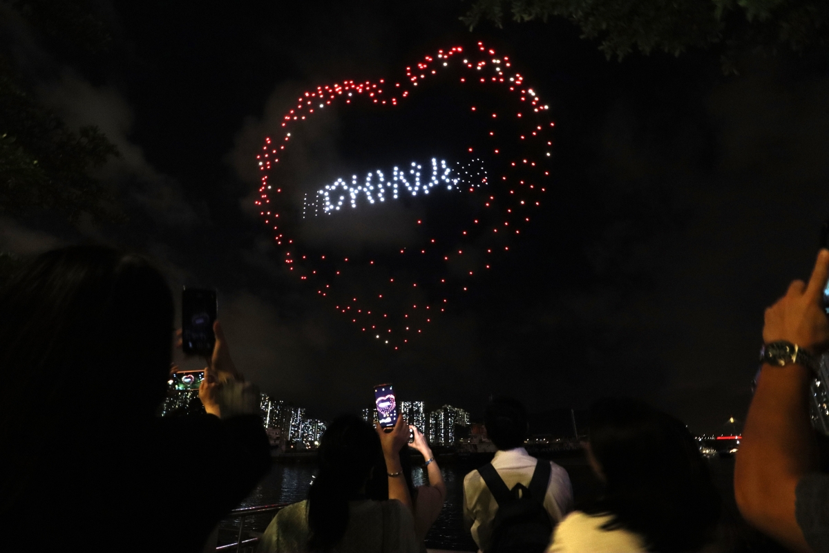 為慶祝香港回歸祖國27周年,荃灣各界合辦無人機表演,有超過350架無人機在夜空上展出不同圖案,吸引眾多市民欣賞