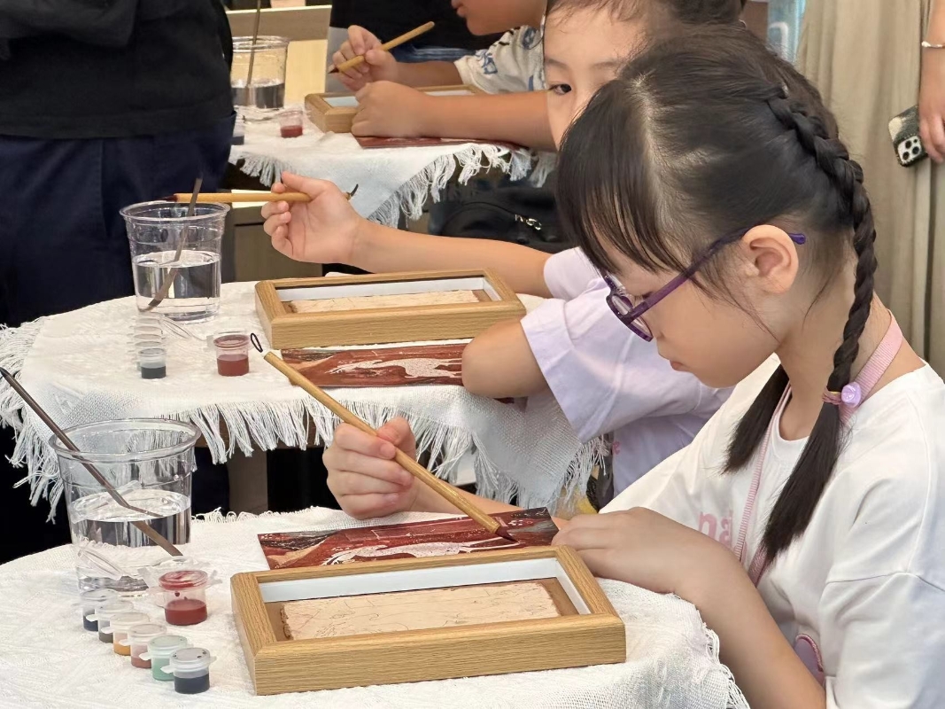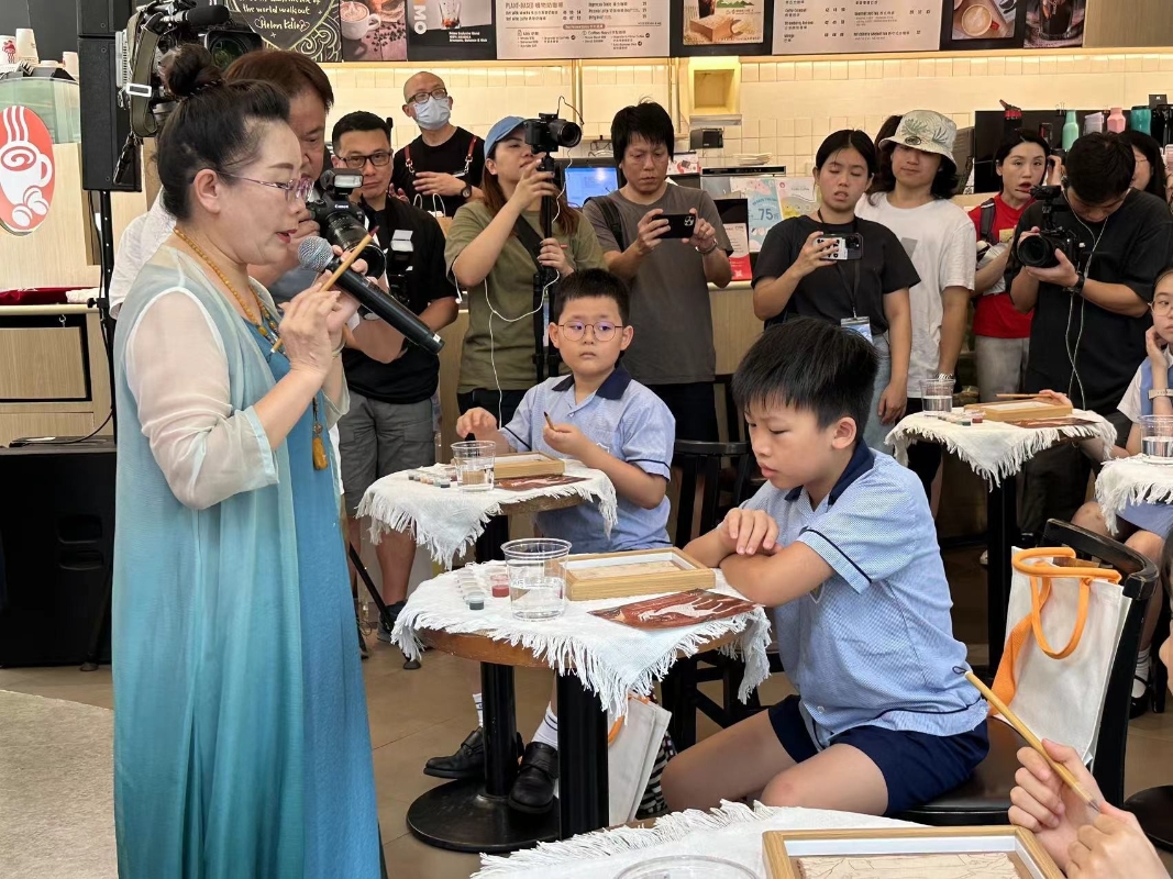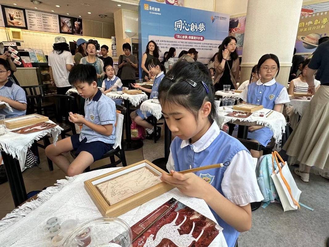 香港中通社記者 陳卓儀攝 主題門店舉辦啟動禮,同日開展敦煌文化藝術慈善公益課程,邀請来自敦煌的導師與學童現場體驗九色鹿填色繪畫,為社區內的青少年提供深入學習中華傳統美育教育的機會,提升文化認知和文化參與意識,培育正向價值觀。