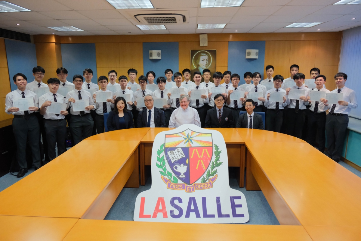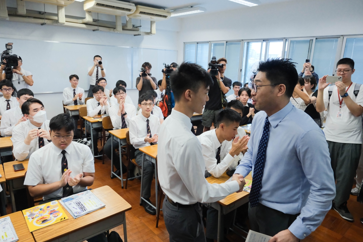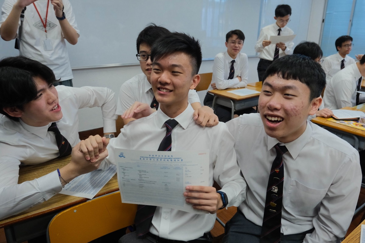 喇沙書院的“超級狀元”鐘栢綸(中)拿到成績後與同學慶祝