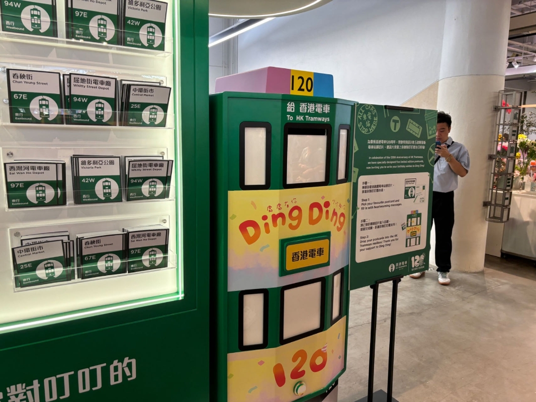二樓打卡點設有電車明信片站,想為香港電車送上生日祝福的市民,可以將明信片投遞至郵箱。(香港中通社記者 黃璇攝) 在二樓打卡點設有電車明信片站,想為香港電車送上生日祝福的市民,可以將明信片投遞至郵箱,工作人員將會選取部分信件展示。除了寫生日祝福,二樓同樣可以享受香港美食,香港電車邀來“媽咪雞蛋仔”及“Chart Coffee”合作,推出雞蛋仔、“Don't 0T”凍檸啡雪葩特調、奶醬多凍咖啡及帶有電車圖樣的熱鮮奶。