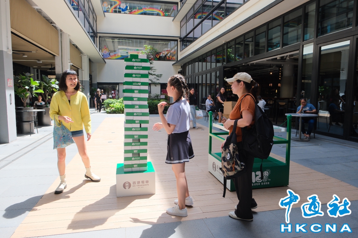 G層則設有親子遊戲攤位,包括巨型層層疊及電車路迷宮遊戲。(香港中通社記者 許其皓攝) 在G層則設有親子遊戲攤位,包括巨型層層疊及電車路迷宮遊戲,層層疊印有有趣的叮叮冷知識,讓大小朋友一起長知識。另一旁設有電車發展史專區,市民也可以順道瀏覽回顧這城市的歷史足跡。 發售多款限定商品及限量紀念郵票 在懷舊的同時,電車也緊貼潮流推出“香港電車 x Snapio自拍亭”,自拍亭配有期間限定的麥兜家庭相框,拍照留念。同時,市民也可以一試運氣,嘗試在裝滿大小“叮叮貓”的夾公仔機內取得“喵”歸,將歡樂帶回家。