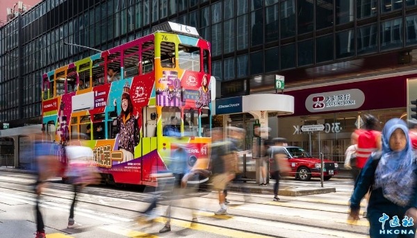 大型“叮叮貓”駐足皇后大道中,化身電車旅遊大使。(香港中通社記者 黃璇攝)