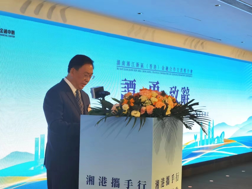 香港中通社圖片。 他表示,期望可通過此次活動,充分利用港交所專業的跨境投資服務和連接中國與世界的獨特優勢,促未來有更多湘江新區的優質企業在港上市。 登高方知天地闊,凌空始信海浪平。中共湖南省委金融委員會辦公室副主任李思維指,湘港合作前景廣闊,湖南企業可充分利用香港的專業服務優勢,加速境外上市融資,推動優勢產業“走出去”。 截至今年六月底,在香港上市的內地企業共有1460家,當中有9家湖南企業,市值約365億港元;中通社記者亦了解到,湖南在港澳設立企業達到406家,佔全省對外投資的40%左右。 香港特區政府財經事務及庫務局局長許正宇表示,香港一直是湖南的主要投資者。去年,湖南實際使用港資大概13億美元,佔全省實際利用外資額的90%。 許正宇在參會途中,曾好奇地詢問道:“湖南人有什麼特點?”與會的湖南友人説:“敢為天下先”。許正宇表示,自己也充分感受到了他們“求新求變”的魄力,希望湘港兩地加強金融合作,在善用香港金融平台助力湘企拓國際業務、深化資本市場聯通、支持數字金融和金融科技創新、推動綠色金融發展四大方面共同努力。