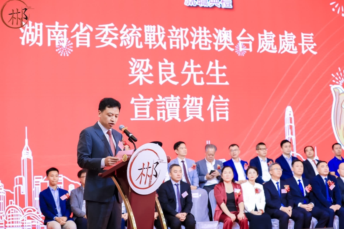 主辦方供圖。 典禮儀式隆重而熱烈,梁良處長宣讀湖南省海外聯誼會發來的賀信,郴州市海外聯誼會為聯誼會送上成立紀念牌,各個友好團體也為郴州聯誼會成立送上祝福。 黃崢嶸部長致辭時首先感謝郴州旅港同鄉會多年來辛勤付出和所作出的積極貢獻,並希望香港湖南郴州聯誼會能堅守辦會宗旨,繼往開來,銳意創新,團結奮進,始終圍繞大局、融入大局、服務大局。從香港擔當、香港視角貫徹落實二十屆三中全會精神,在守牢國家安全底線、強化對外開放、深化大灣區和郴港兩地合作等方面發揮更大作用。