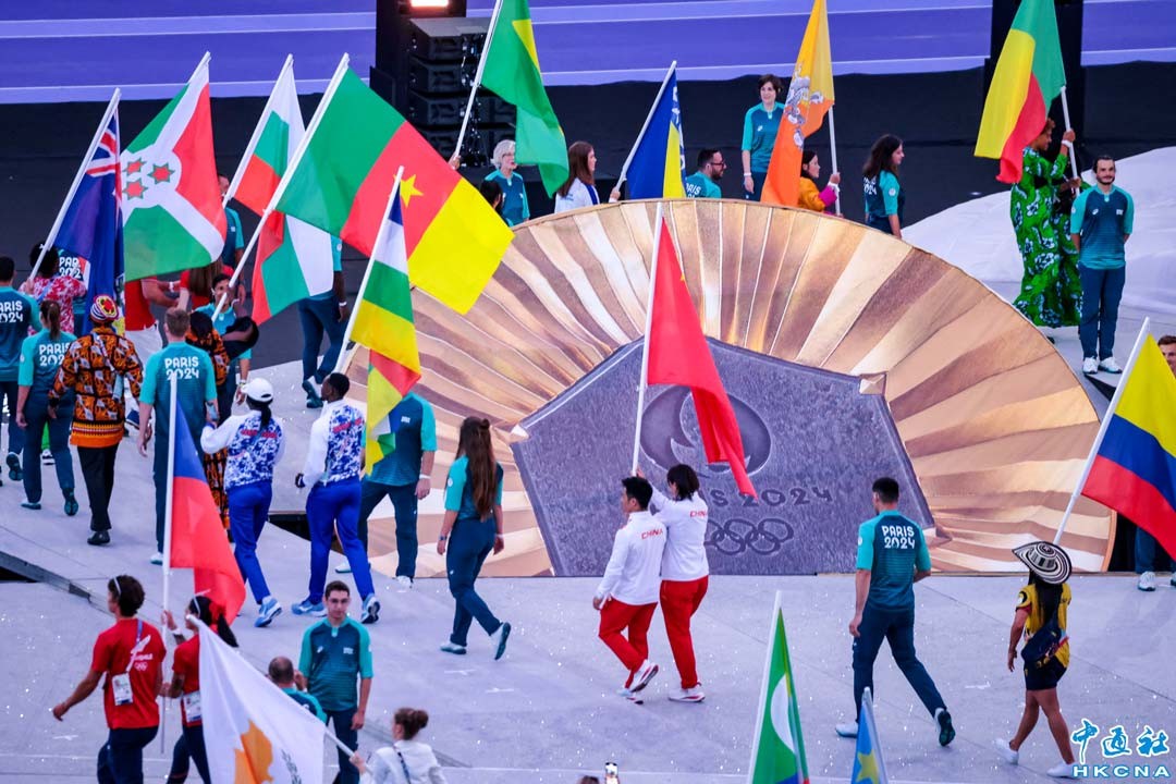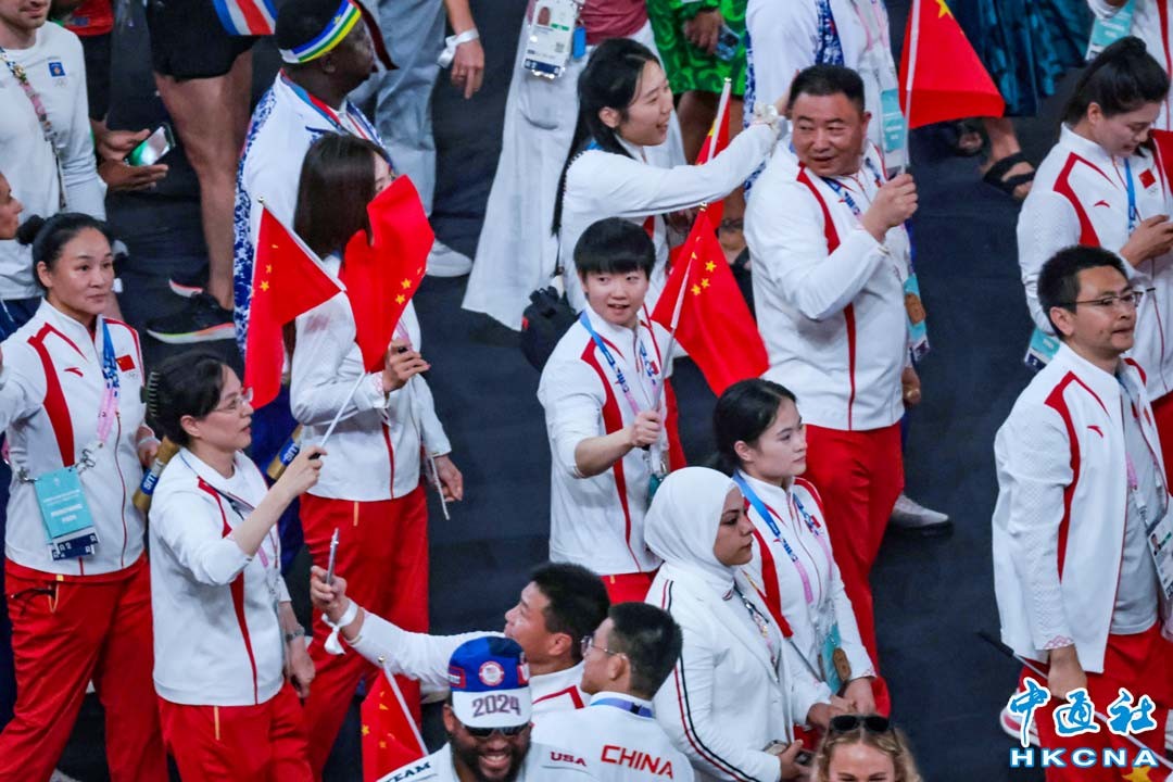 當地時間8月11日,第33屆夏季奧林匹克運動會閉幕式在法國巴黎法蘭西體育場舉行。圖為中國體育代表團旗手舉重奧運冠軍李發彬、中國女子曲棍球隊隊長歐紫霞高舉五星紅旗入場。(香港中通社記者 謝光磊 攝)
