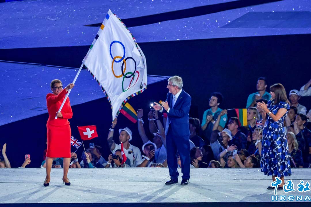 當地時間8月11日,第33屆夏季奧林匹克運動會閉幕式在法國巴黎法蘭西體育場舉行。圖為洛杉磯市市長卡倫·巴斯(左)與國際奧委會主席巴赫(中)在會旗交接儀式上。(香港中通社記者 謝光磊攝)