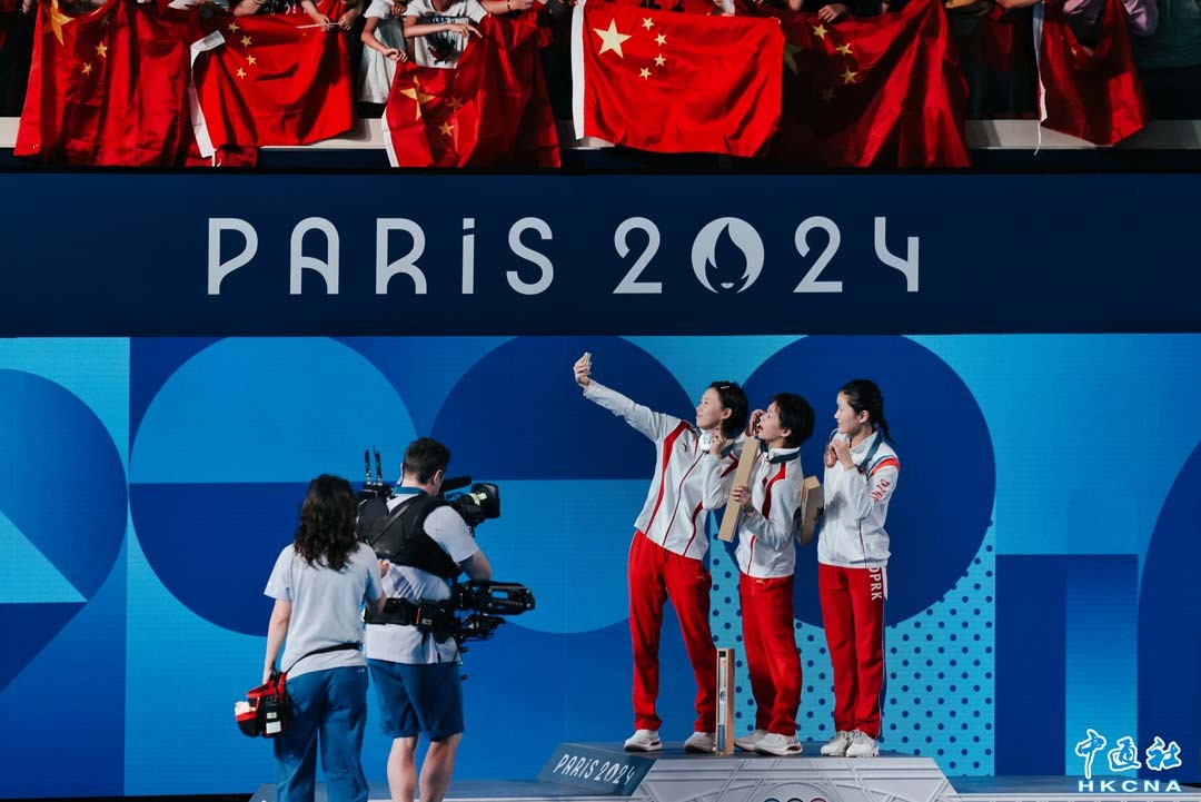 當地時間8月6日,在巴黎奧運會跳水項目女子10米跳台決賽中,中國選手全紅嬋獲得金牌,另一名中國選手陳芋汐獲得銀牌。圖為頒獎典禮。(香港中通社記者 謝光磊攝)