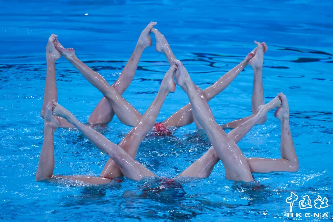 當地時間8月7日,巴黎奧運會花樣游泳集體項目最後一項比賽——集體技巧自選展開爭奪,中國隊分數排名第一。至此,中國隊在集體技術自選、集體自由自選、集體技巧自選三項比賽總分排名第一,收獲巴黎奧運會花樣游泳集體項目金牌,這是中國隊歷史上第一枚奧運會花樣游泳金牌。圖為中國隊隊員在比賽中。(香港中通社記者 謝光磊攝)
