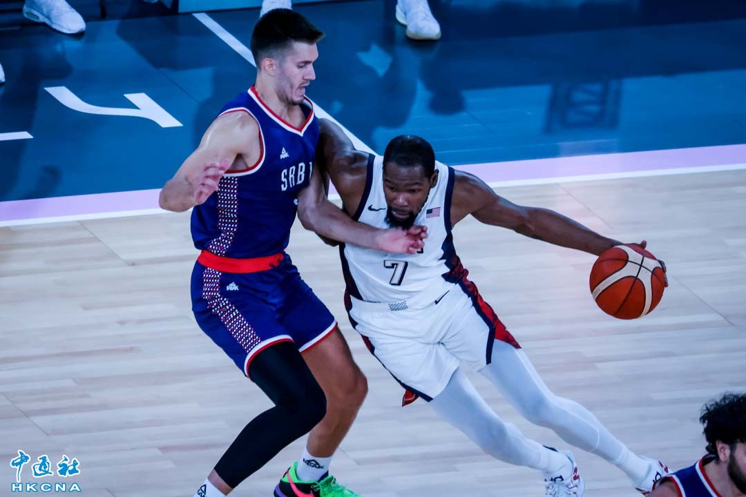 當地時間8月8日,巴黎奧運會迎來男籃半決賽爭奪,美國隊95:91逆轉塞爾維亞隊,與東道主法國隊會師男籃決賽。圖為美國隊球員杜蘭特在比賽中。(香港中通社記者 謝光磊攝)