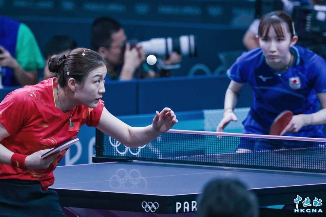 當地時間8月10日,在巴黎奧運會乒乓球女子團體決賽中,中國隊戰勝日本隊奪得金牌。圖為中國組合陳夢/王曼昱在比賽中。她們3比2戰勝日本組合早田希娜/張本美和。(香港中通社記者 謝光磊攝)