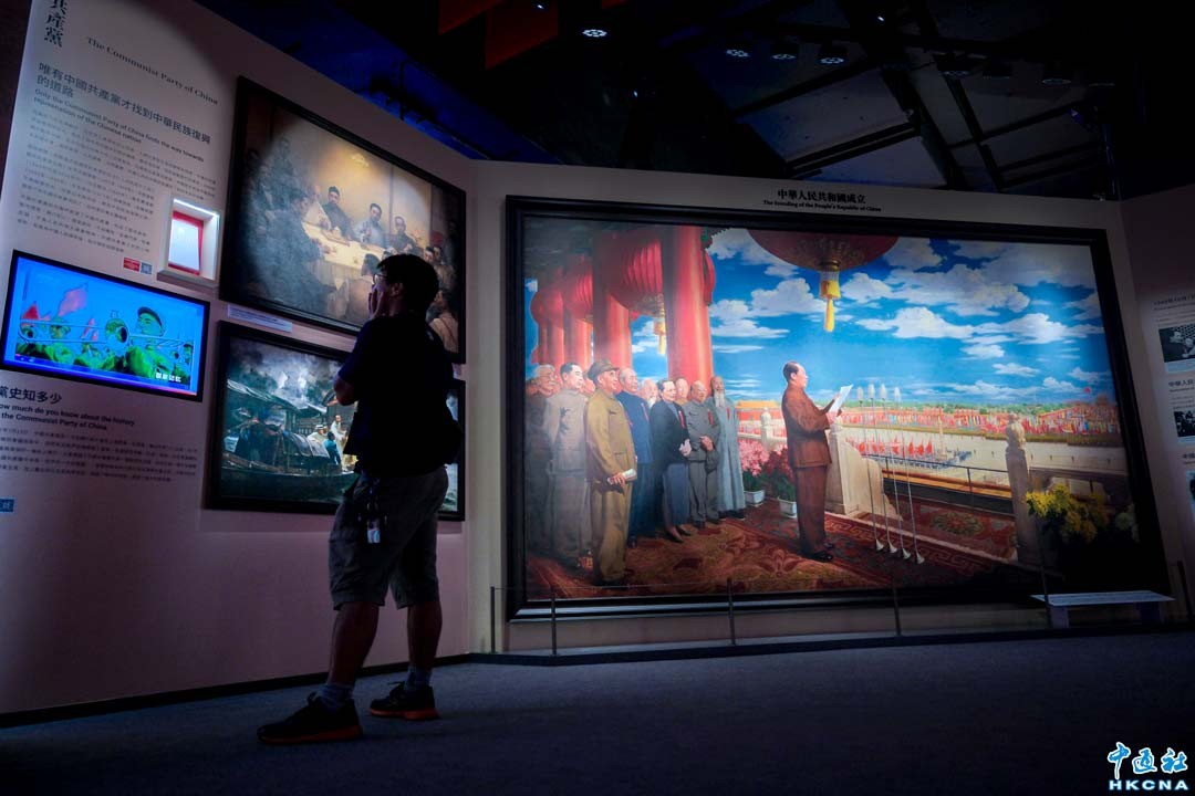 8月6日,香港特別行政區國家安全展覽廳在香港歷史博物館開幕。香港特別行政區國家安全展覽廳是香港特區首個有系統地介紹國家安全的專廳,旨在推動市民認識國家安全的積極意義,及提高市民對國家安全的責任感和主人翁意識。展覽廳將於8月7日起對公眾開放。圖為“開國大典”油畫(官方複製品)。(香港中通社記者 許其皓攝)