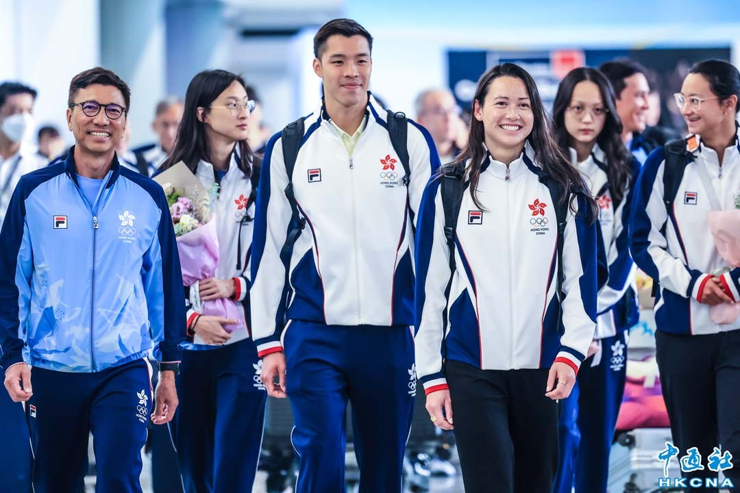 8月6日,巴黎奧運2銅得主何詩蓓與隊員一同凱旋。何詩蓓在女子100米和200米自由泳兩個項目取得銅牌,個人連同上屆東京奧運同樣項目取得2枚銀牌,兩屆奧運累積2銀2銅共4枚獎牌,繼續成為香港代表隊中奪得奧運獎牌最多的運動員。(香港中通社記者 曹文毓攝)