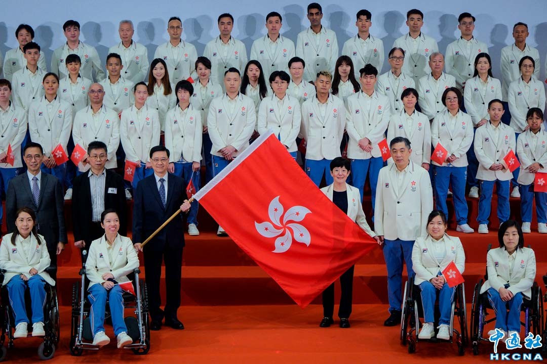 8月9日,巴黎2024殘疾人奧運會中國香港代表團授旗儀式在香港政府總部舉行。巴黎2024殘疾人奧運會將於8月28日至9月8日舉行,此次殘奧會共有22個競賽項目,中國香港將派出23位運動員出戰共8項項目,當中亦有不少運動員是首次出戰殘疾人奧運會。(香港中通社記者 許其皓攝)