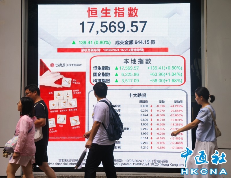 香港中通社8月19日電(記者 譚暢)港股承接上周五升勢,恒指19日收市報17569點,升139點或0.8%。大市全日成交約944億港元。